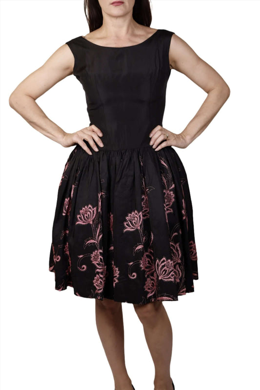 Black Dress w/ Pink Floral Embroidery & Pleats 1950s