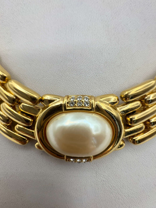 Givenchy, Gold Wide Link Statement Necklace w/ Rhinestones & Pearl 1980s