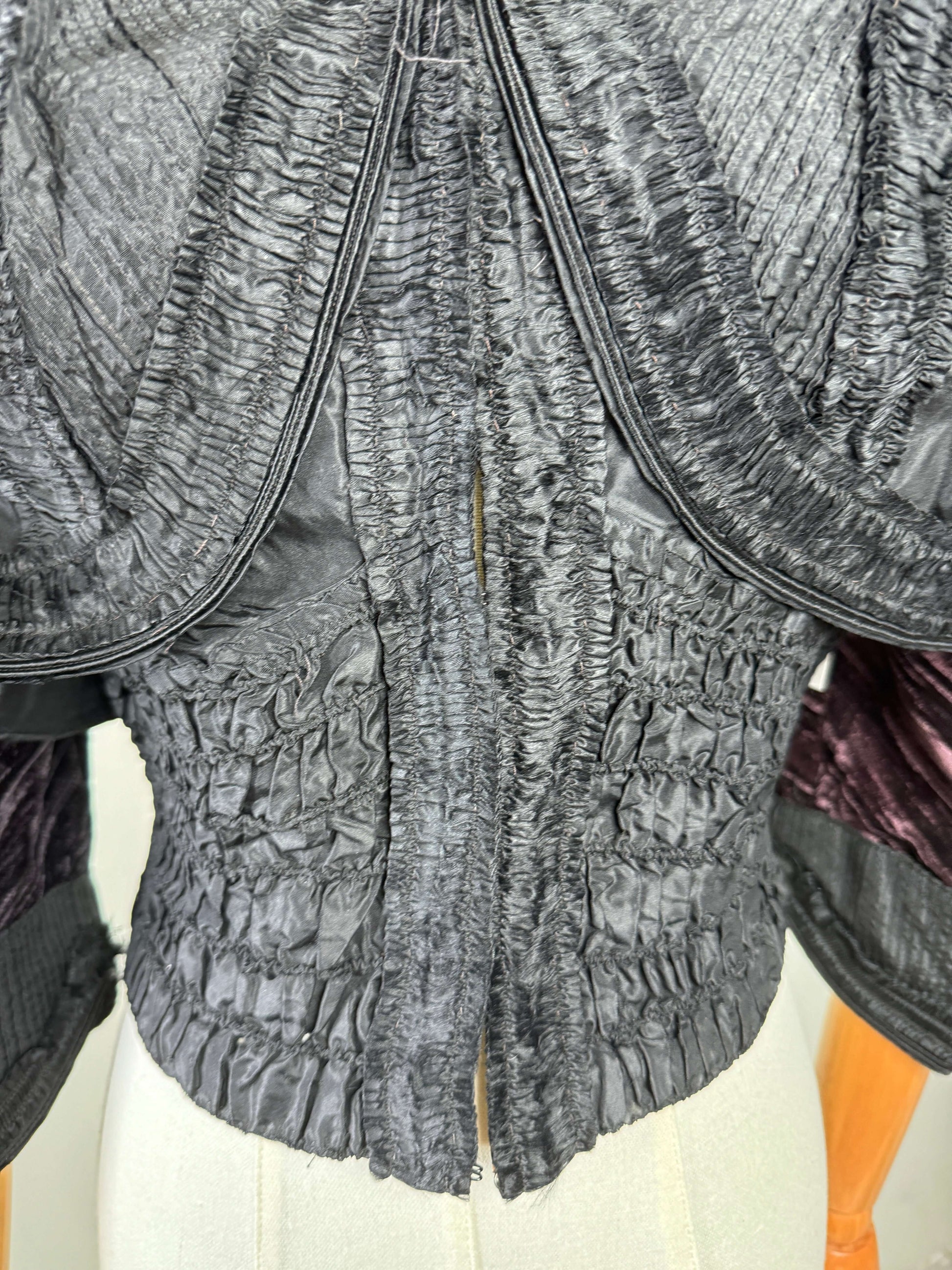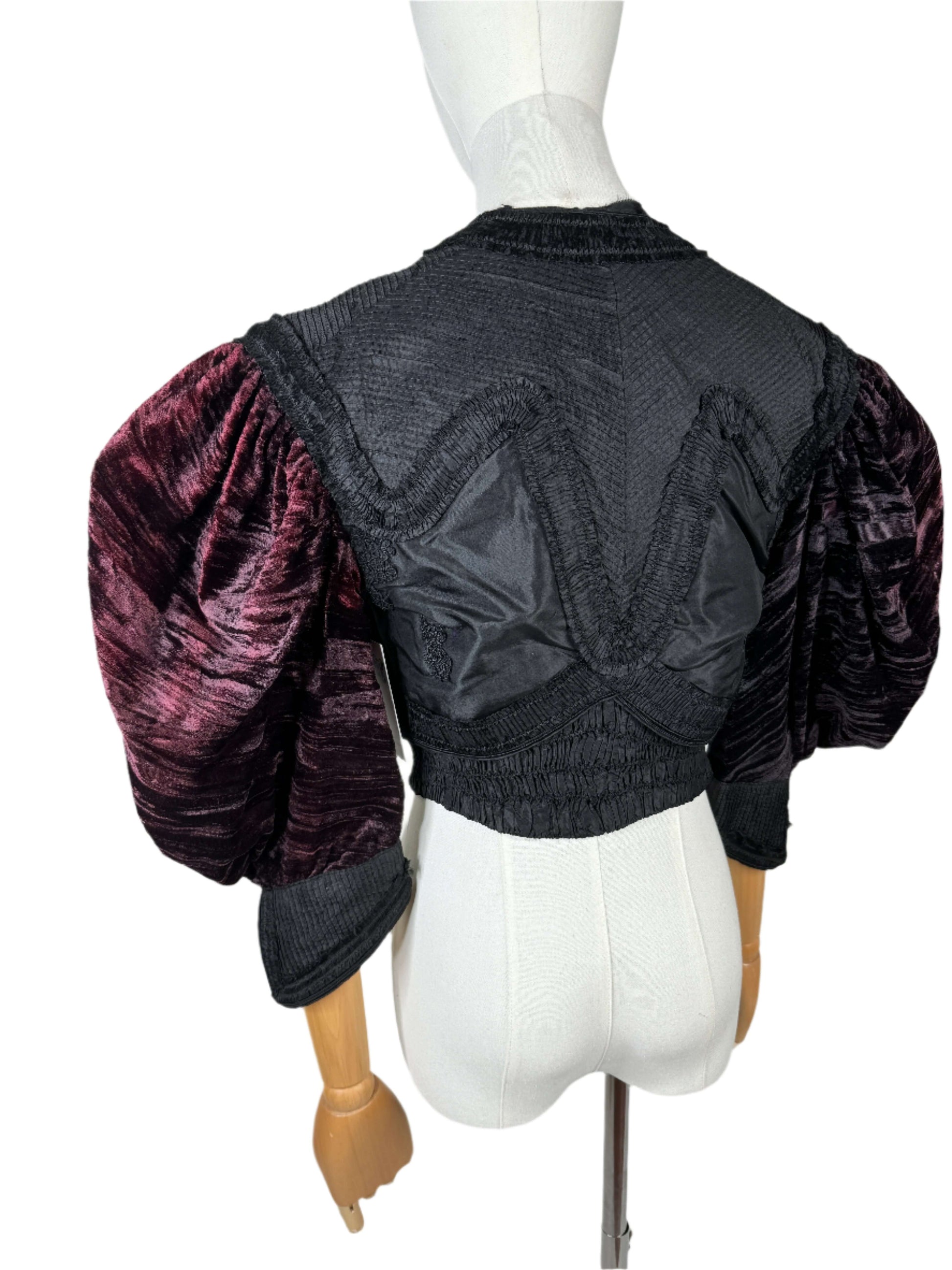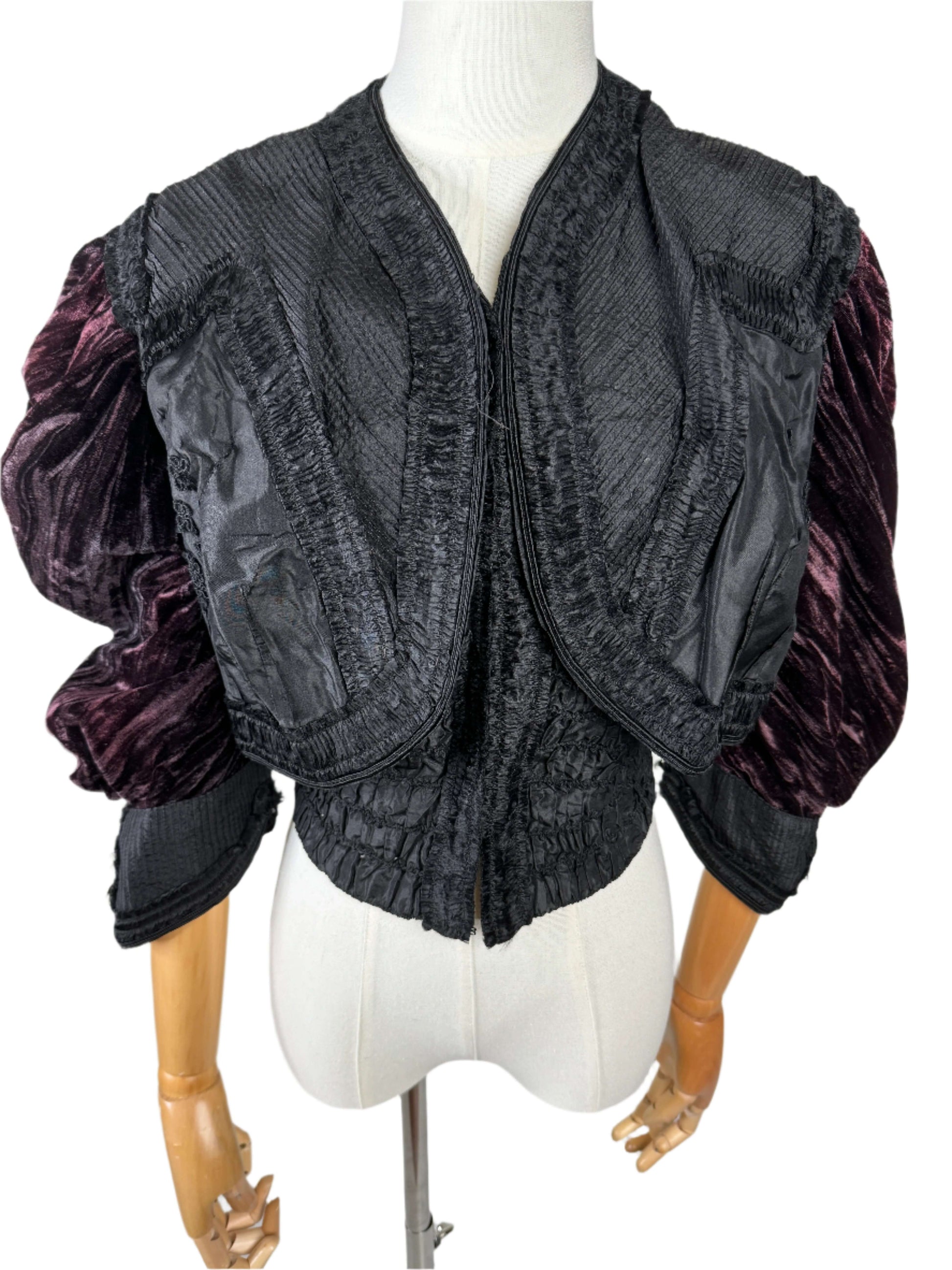 This antique 1900s Victorian bolero jacket is in fantastic condition for its age. The Bodice closes with hook and eyes, and is overlayed with a swooping pintucked and embroidered fabric. The tulip sleeves are in crushed velvet that has pintucked cuffs in the same fabric as the bodice. A true piece of art and history that deserves to be preserved.