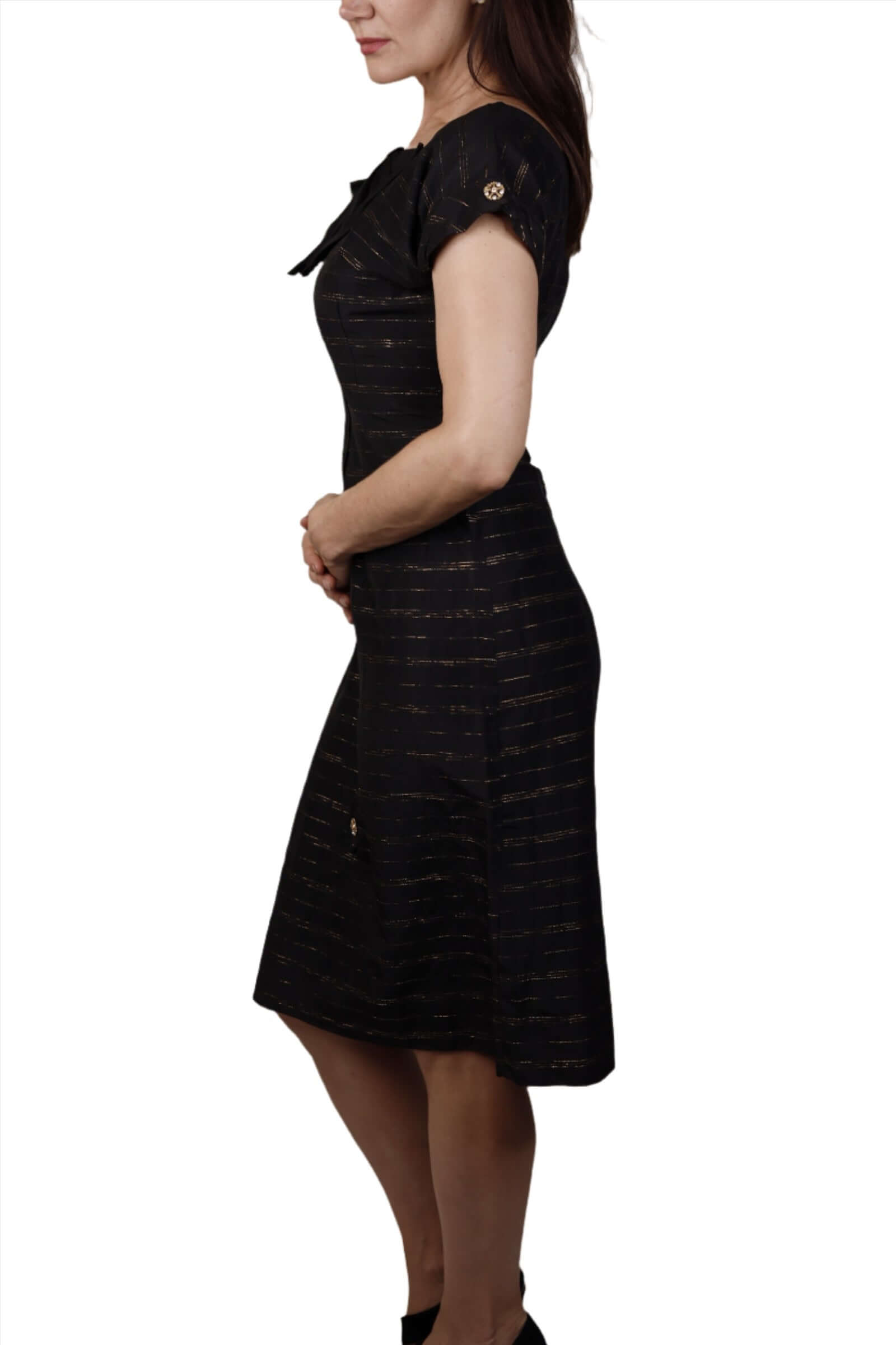 A black sheath taffeta dress from the 1940s with a black bow adorned at the neckline, gold vertical pinstripe and pockets. A conservative vintage dress, that could be an LBD go to.