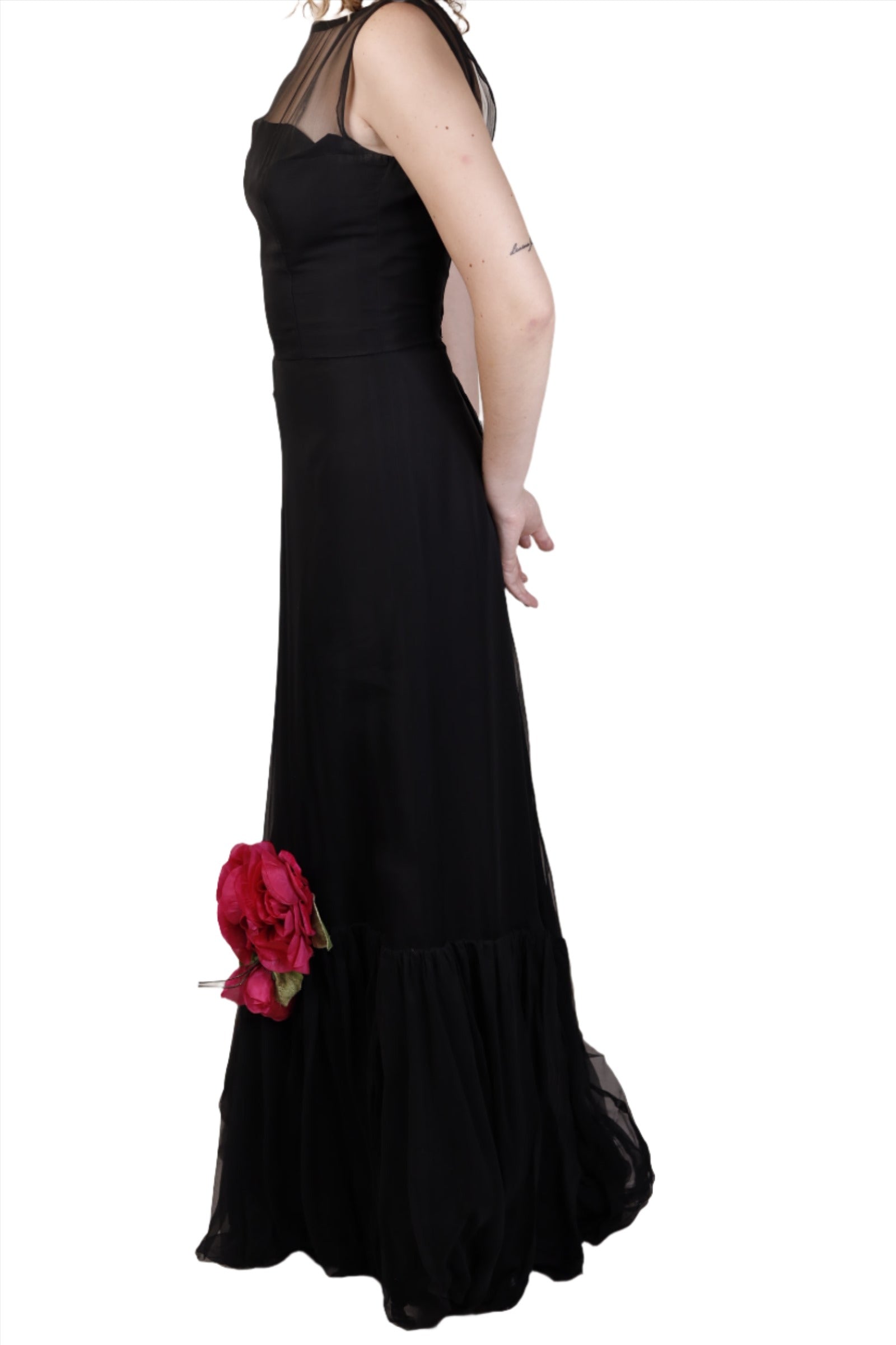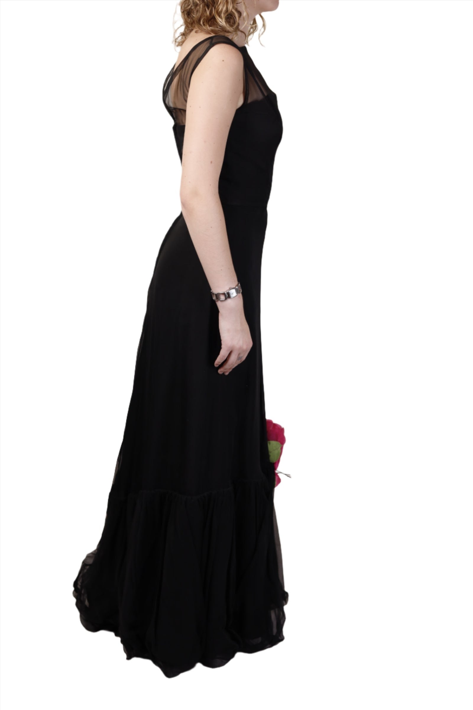 Carrie Bradshaw approved! Part the sidewalks as you glide across the city in this gorgeous black chiffon vintage evening dress with sheer bodice and pink flower applique. Constructed in black chiffon, lined, with side zipper, this black vintage dress will wow all the crowds and make you feel like dancing the flamenco!