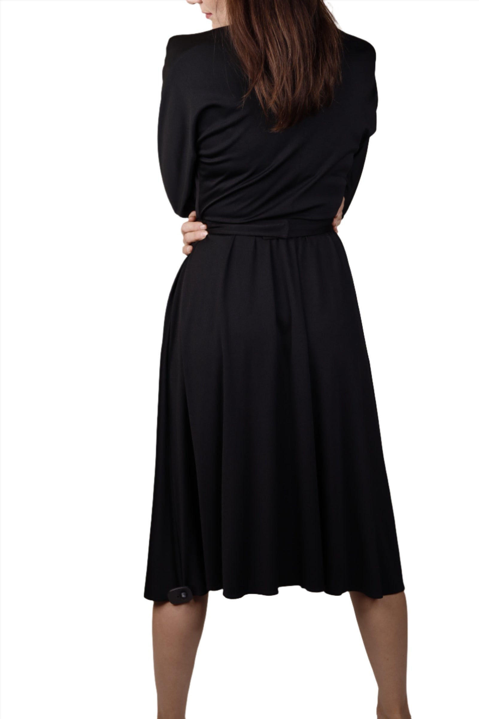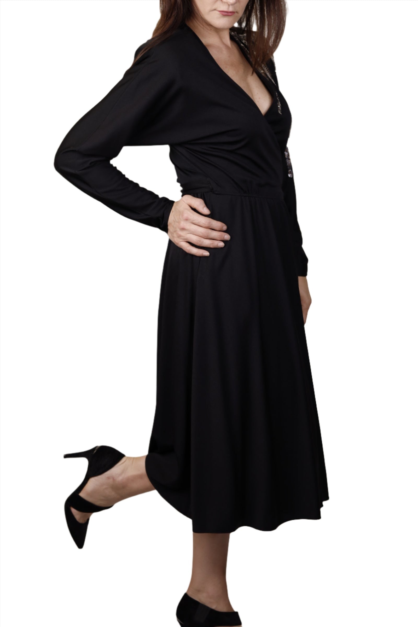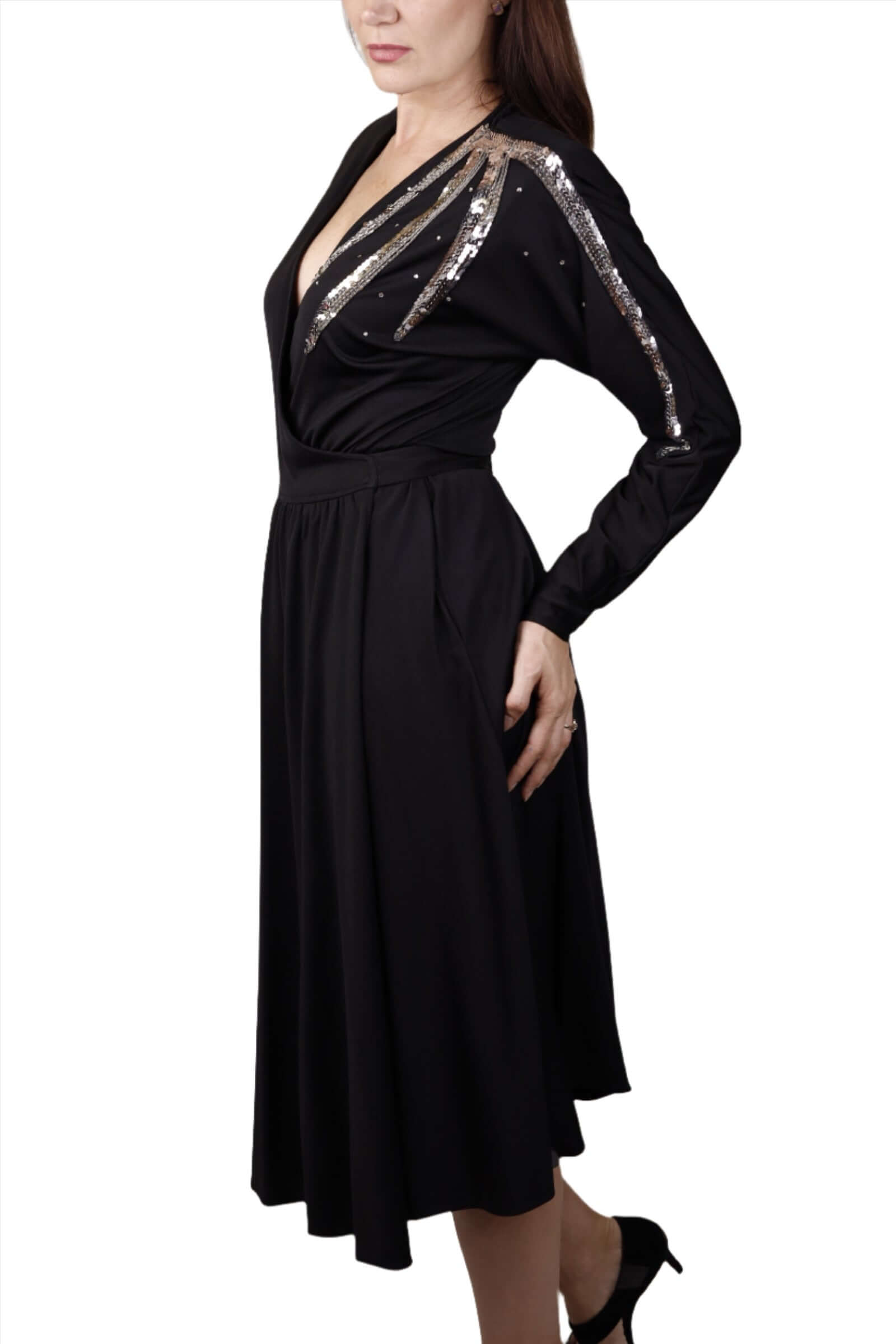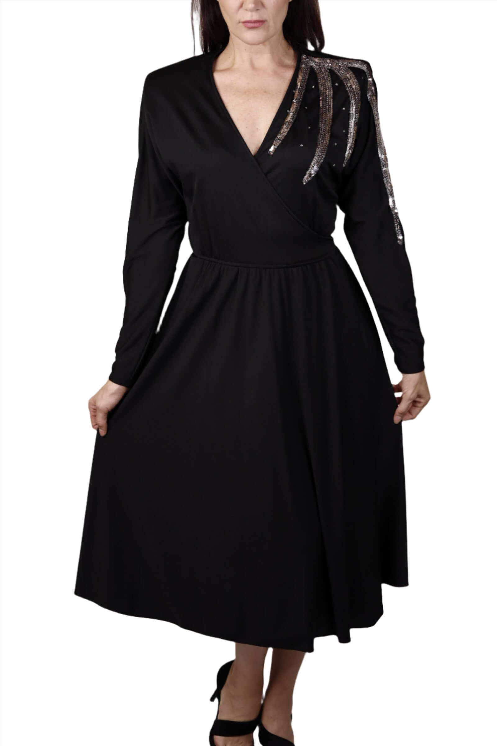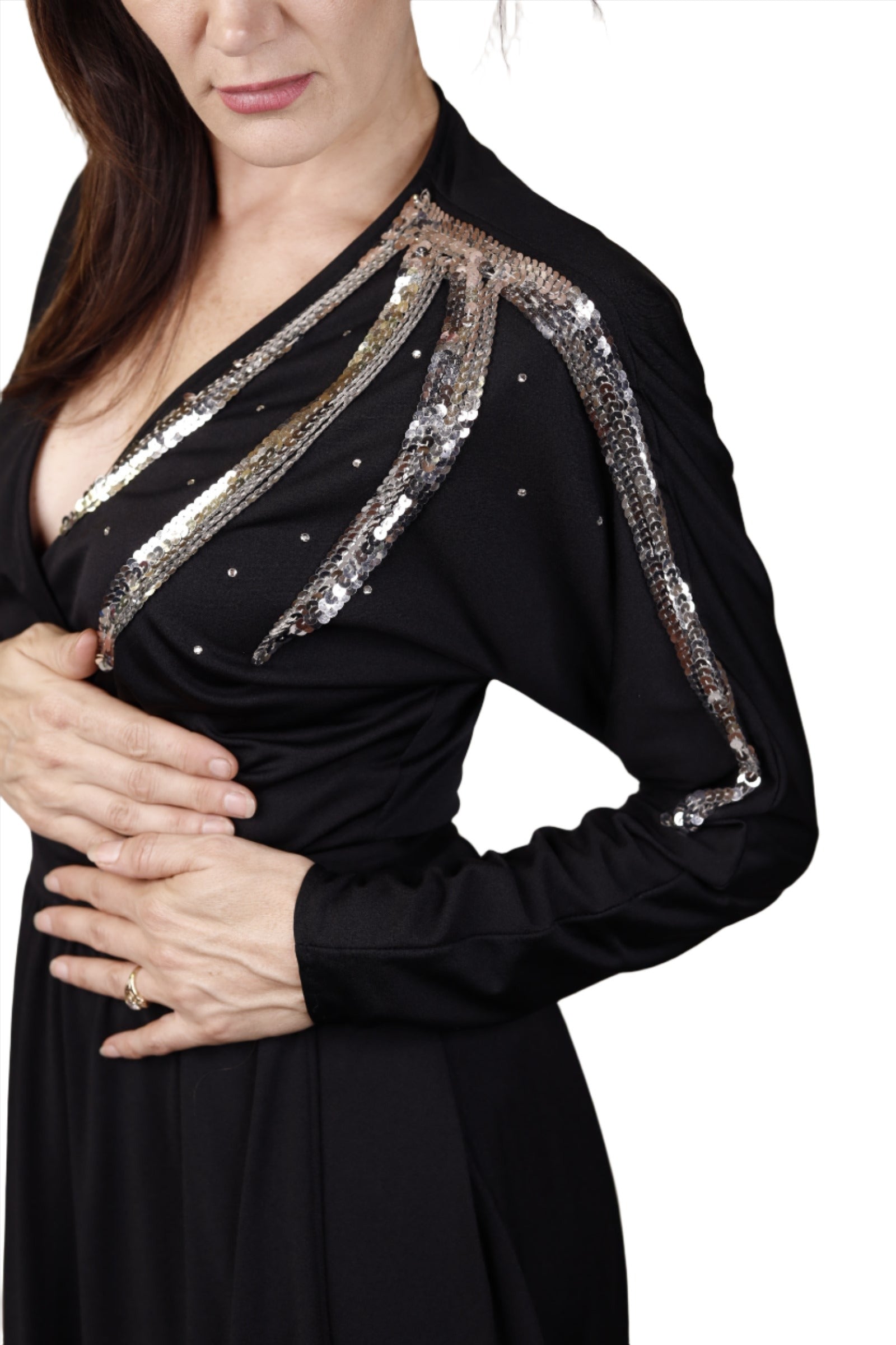 Studio 54 perfection! A black vintage disco dress with dolman sleeves and silver sequins adorning the shoulder. Dance the night away and find your groove in this little 1970s vintage dress.