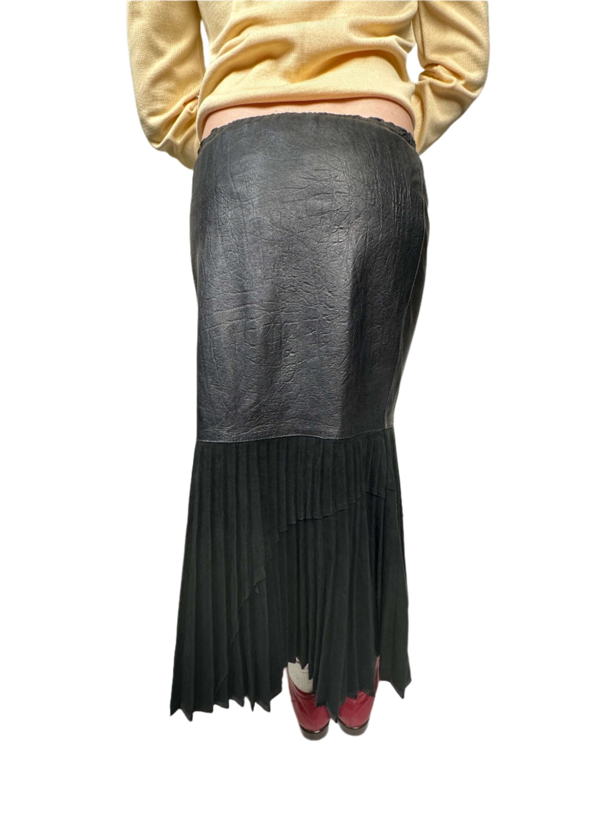 Stellar vintage mermaid midi skirt by Rena Zurlo. This Italian made skirt is a combination of soft lambs leather that flows out into pleated suede panels. Truly a beautifully crafted garment, with an elastic waist that can accommodate many different waist sizes. Sourced in Milan.