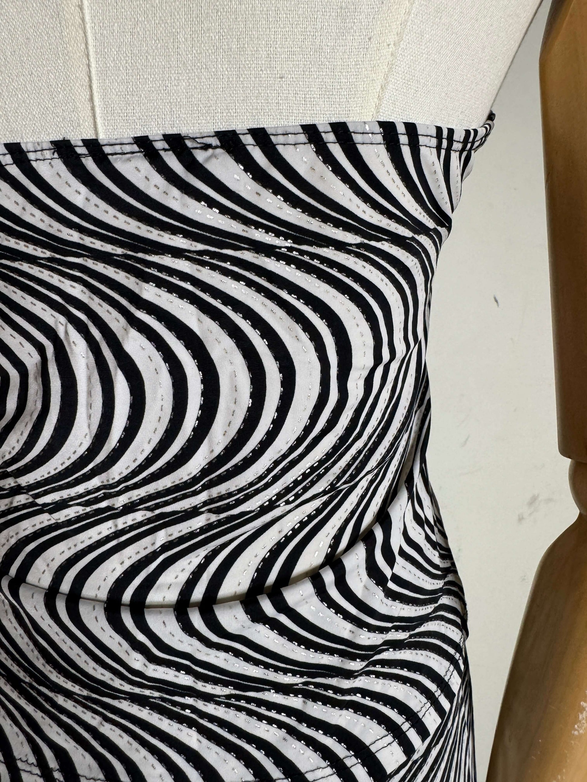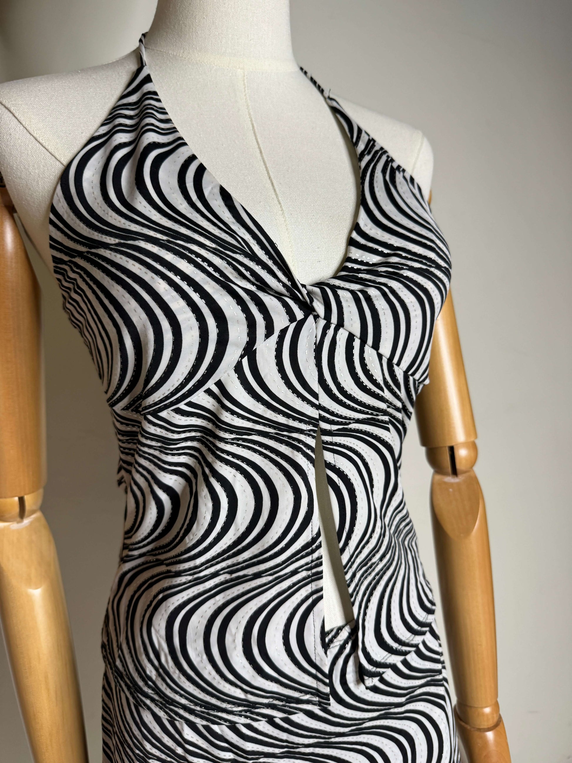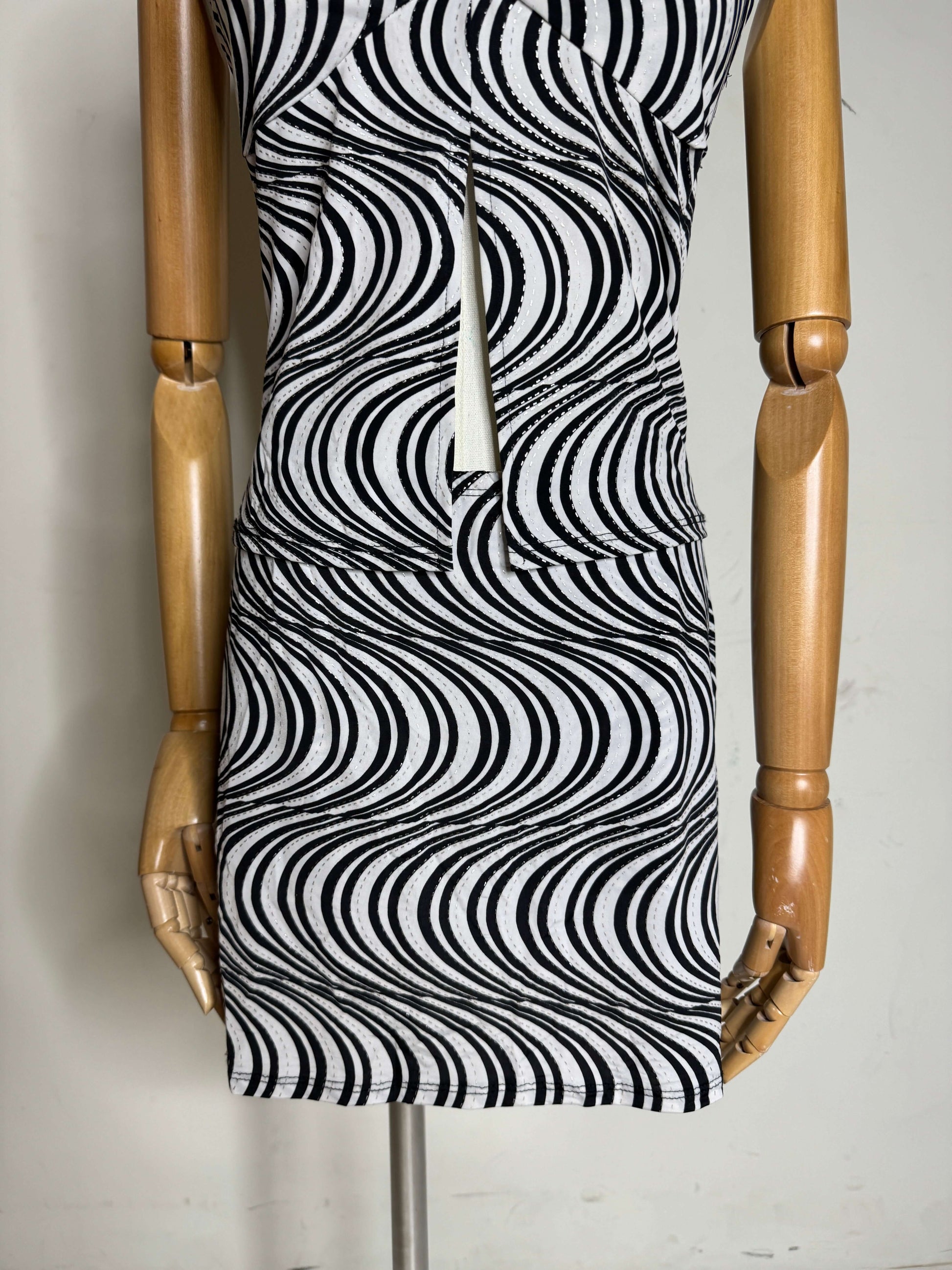 This 1980s black & white swirly set is what disco dreams are made of! This set features a sexy lil' halter top with a tie back, slit to expose a little midriff and a matching mini skirt! This piece is part of a Vintage Performance Wear collection, it was custom made in the 80s and is ready for a new diva to rock her! This set is perfect for a beach vacation, music festival or just everyday wear if you're a true fashionista!