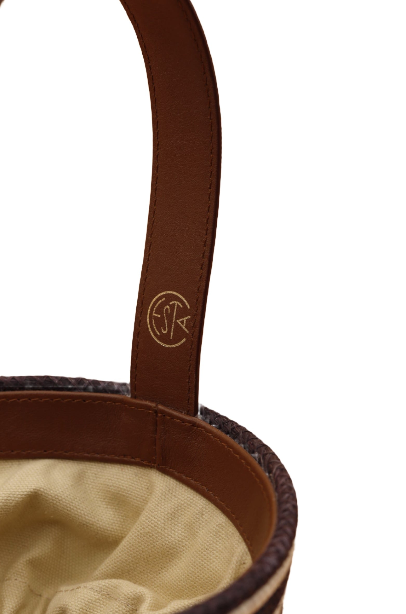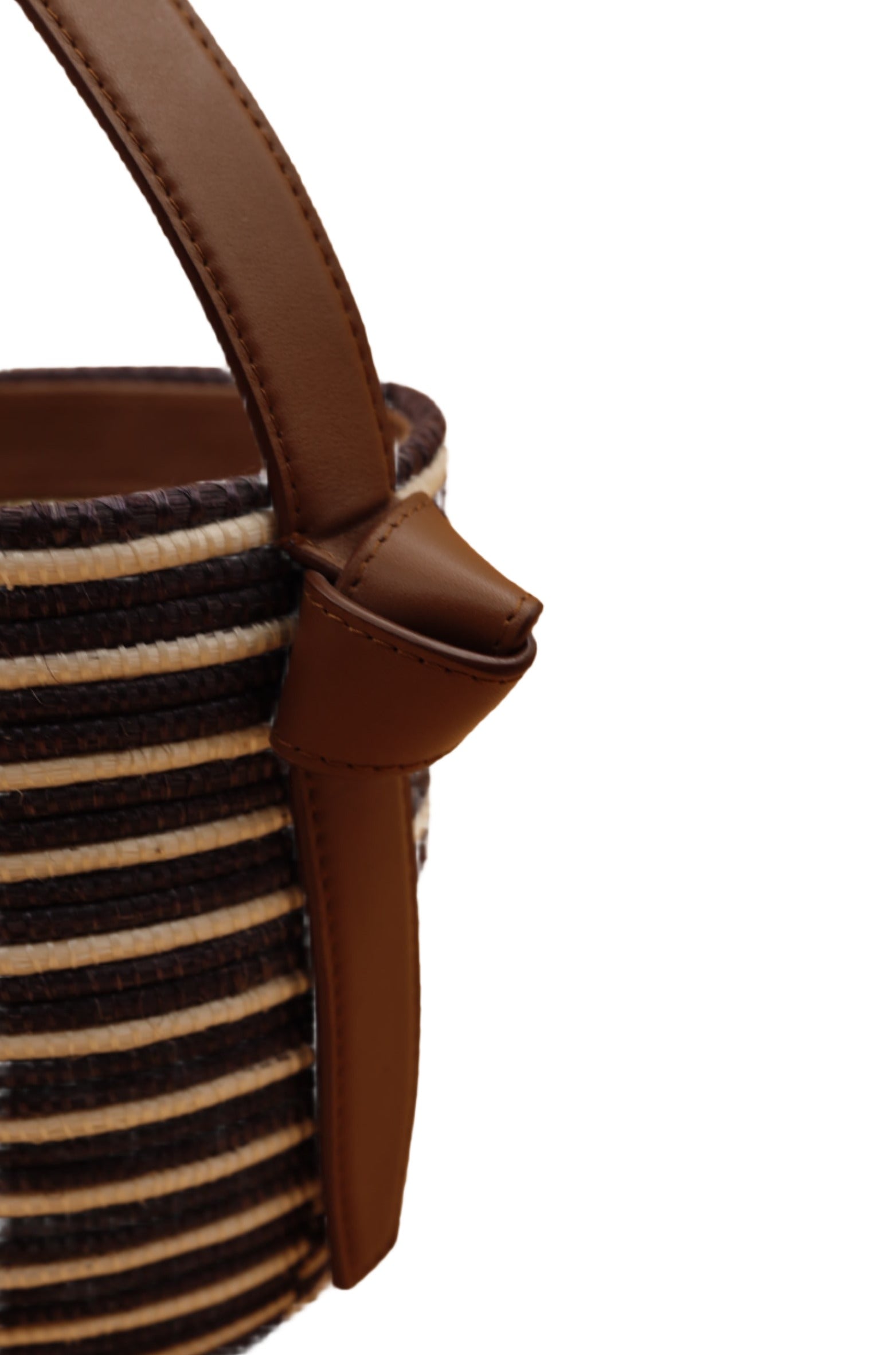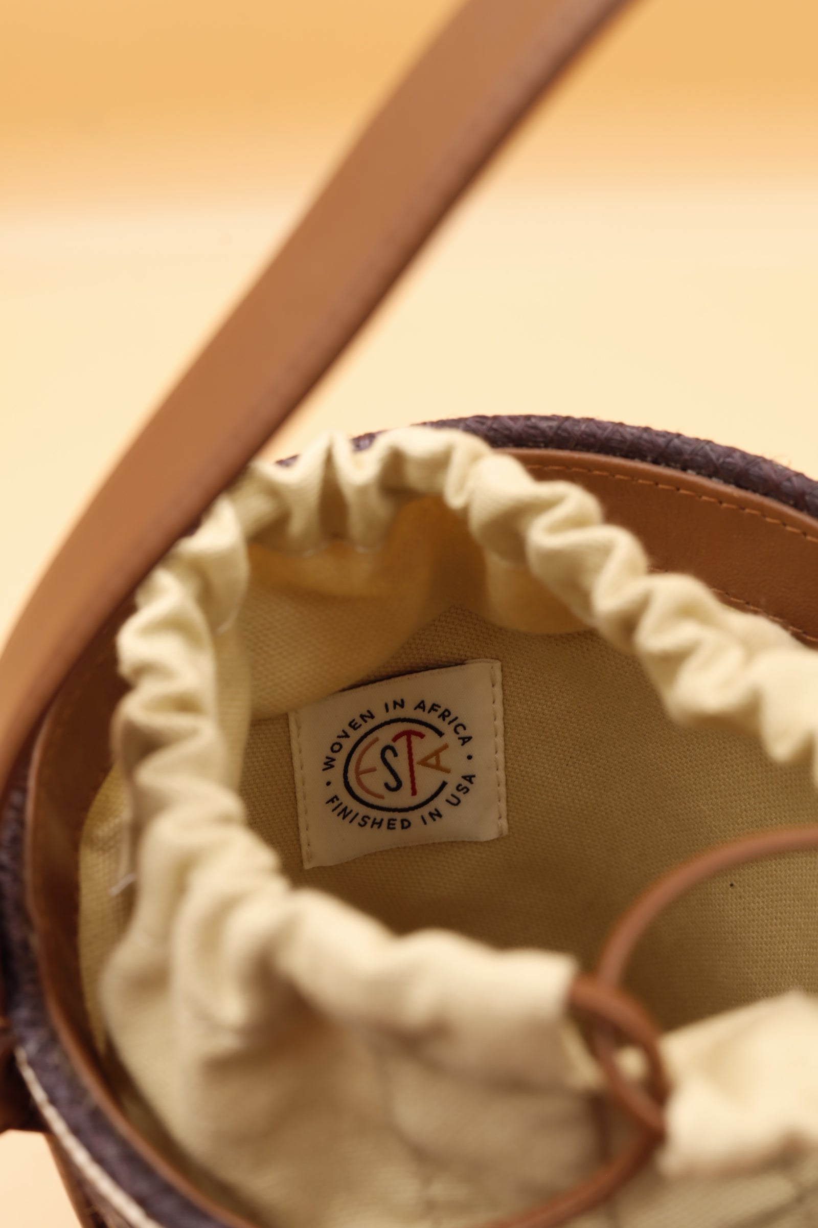 A perfect summer bucket handbag by Cesta Collective. This little pail has it all! A brown leather hand strap, a tan linen bag lining with a leather drawstring closure. Cute and petite this raffia lunch pail purse is precious and for a great cause! Each Cesta is handwoven in Rwanda, finished in Italy or USA. Luxury basket bags with a purpose. We are fans!