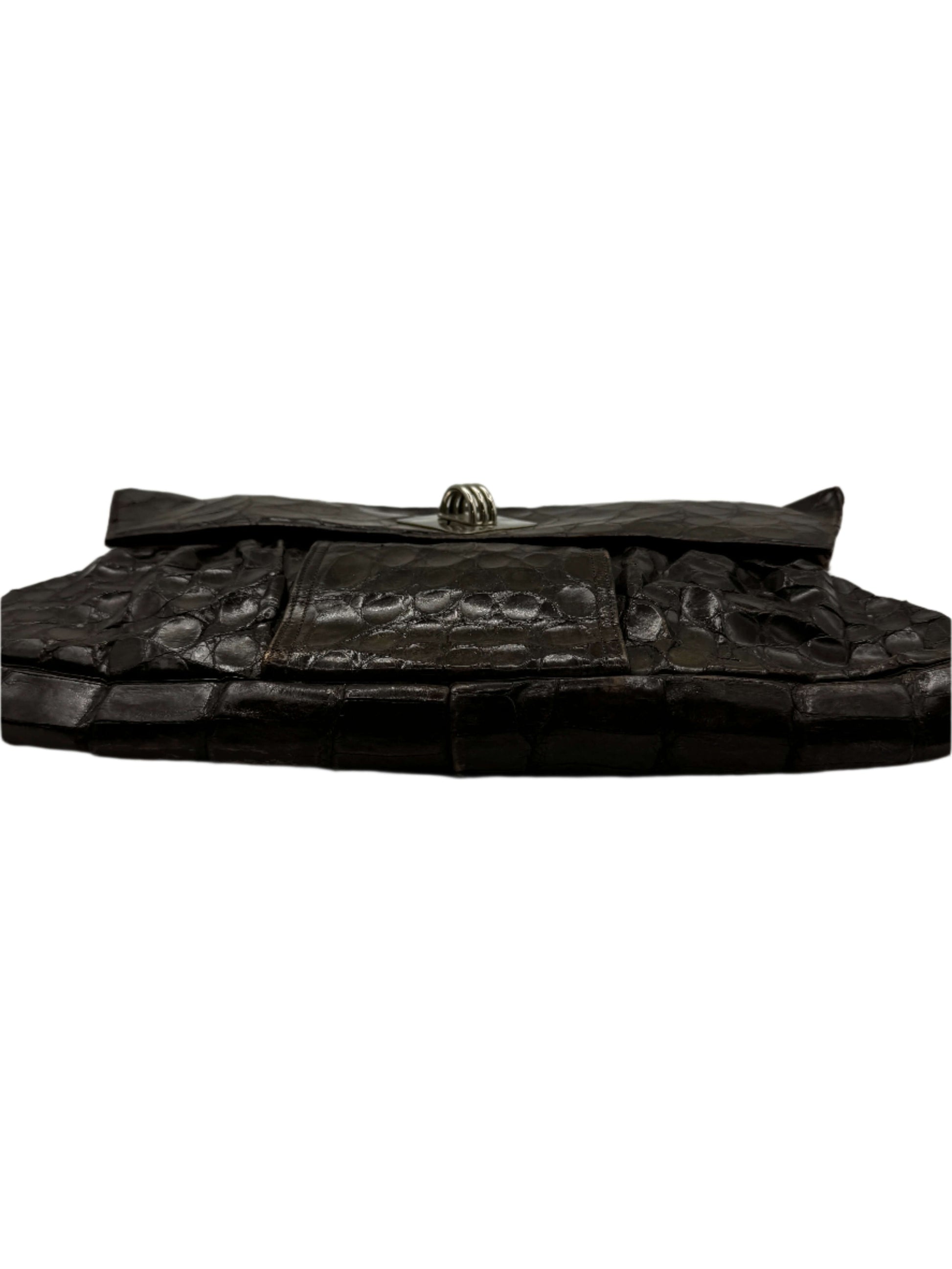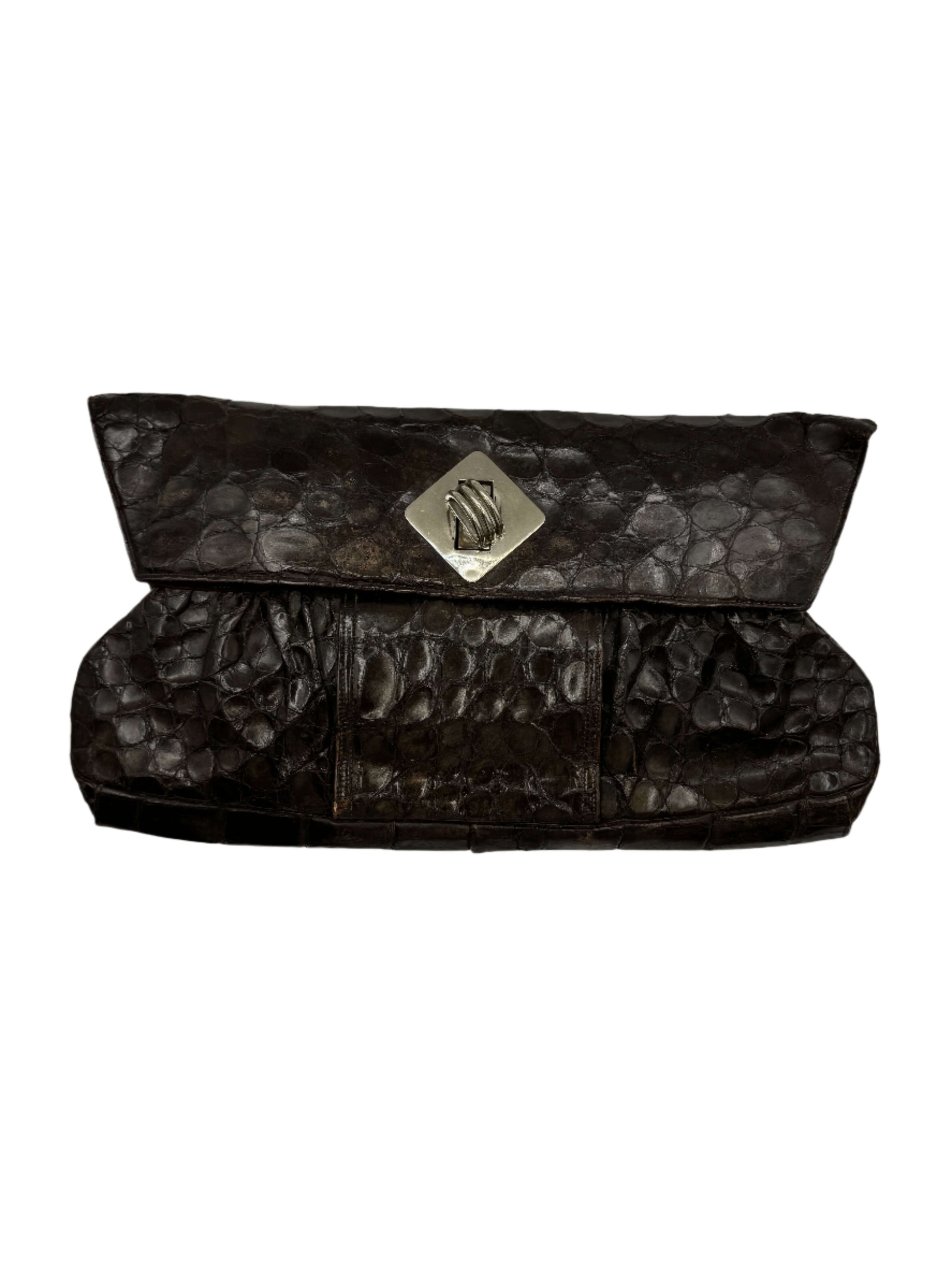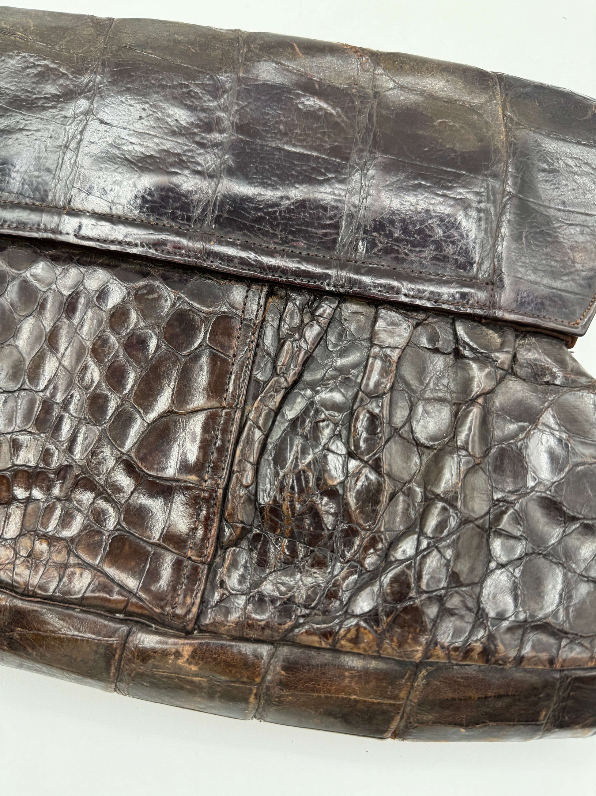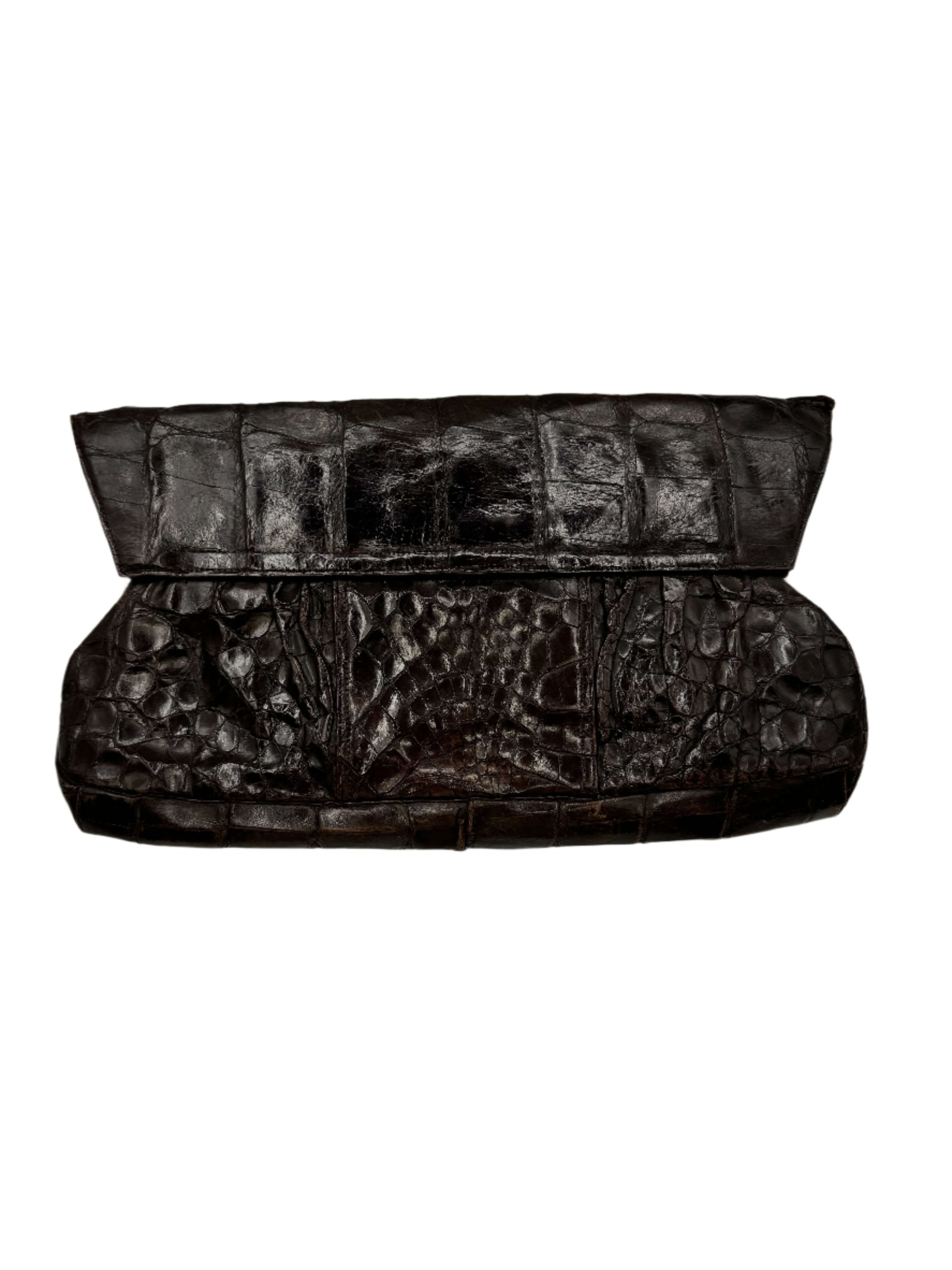 Ooohhh yeaaaa this is some genuine alligator that Boss Babe herself wrestled off this swamp dragon. This made in Argentina clutch has a modern silver tone twist lock that shine against the chocolate brown gator. Inside is lined with multiple pockets for storing whatever you need on your night out.