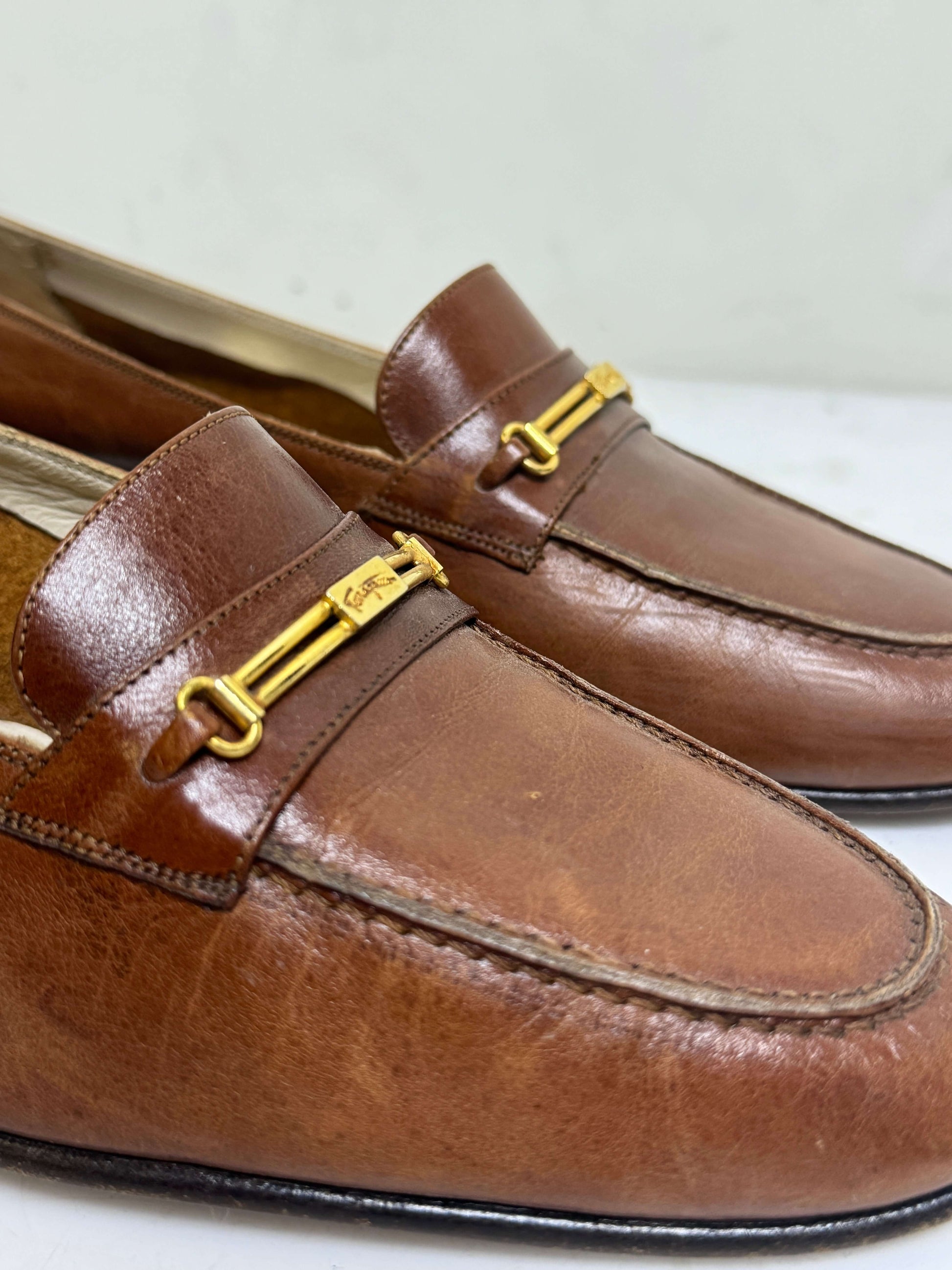Oh yes... 1970s Ferragamo Loafers. These nutty brown full leather loafers are in near perfect condition with the iconic gold Ferragamo plate on each shoe and the gold Ferragamo script in each sole. These were purchased in Italy in the 70s and have been wonderfully cared for leaving them full of charm. Original serial number in tact on right side of the inside of the left shoe.