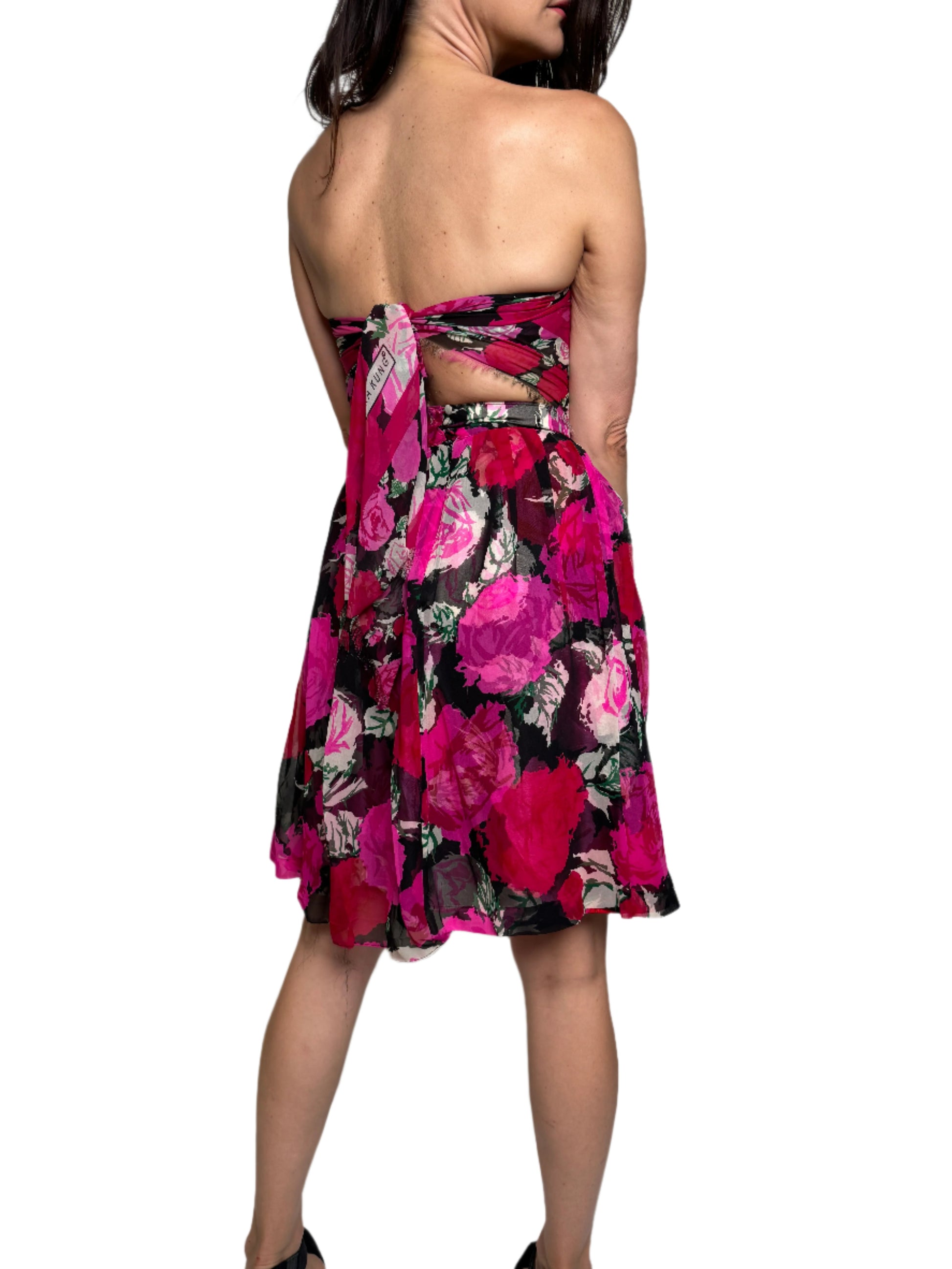 Flora Kung, Black & Pink Floral Chiffon Skirt & Scarf Set 1980s