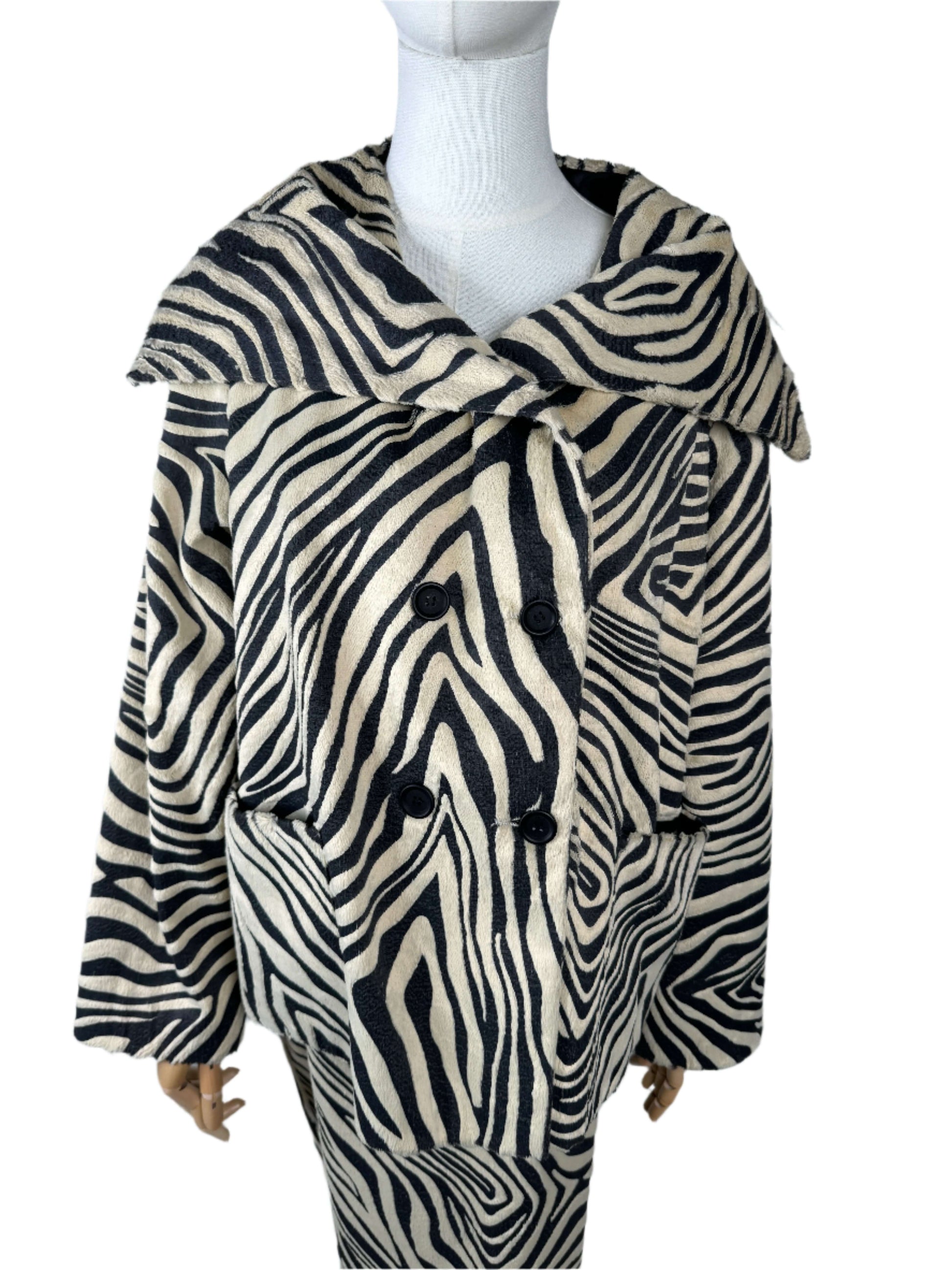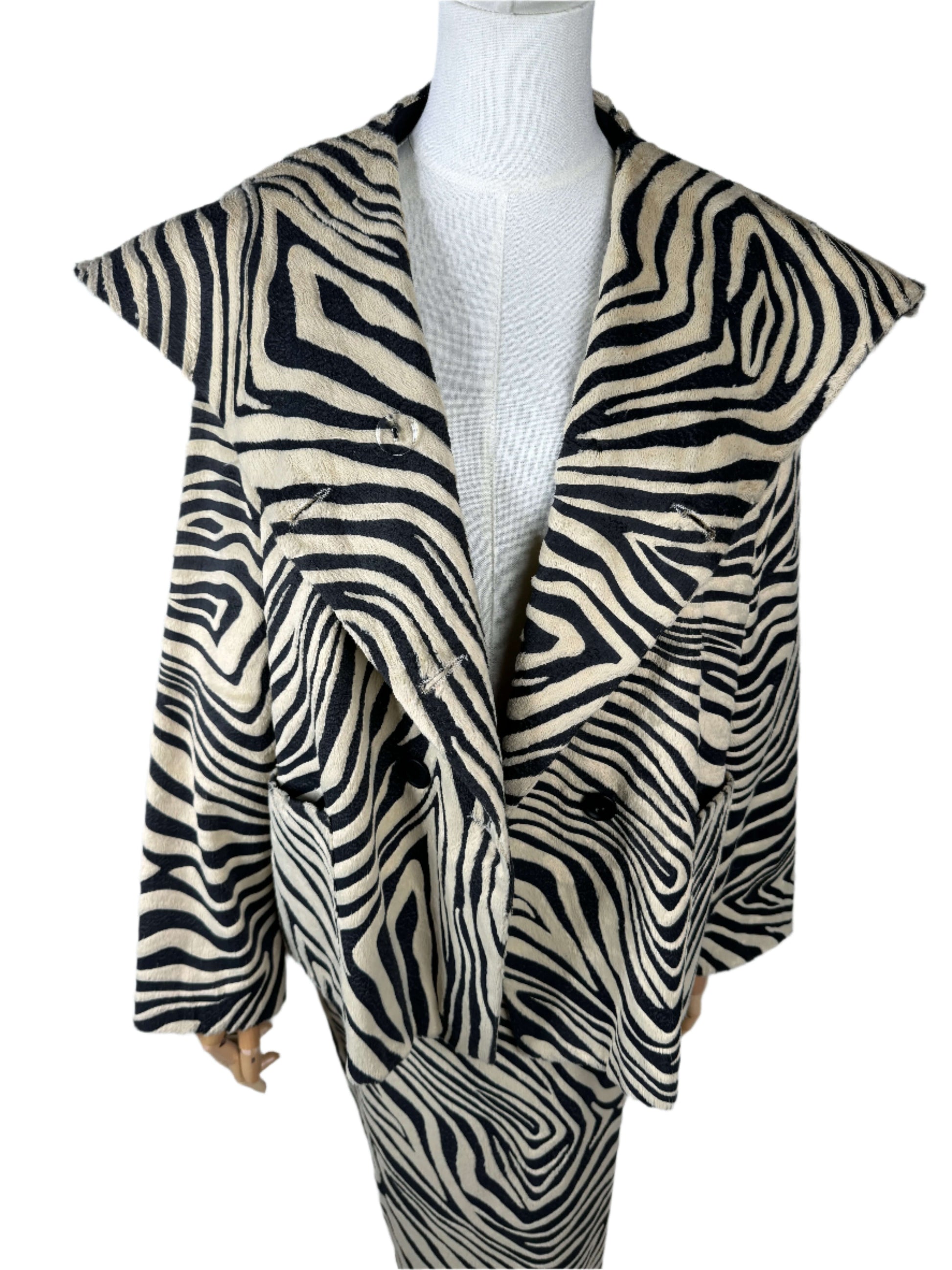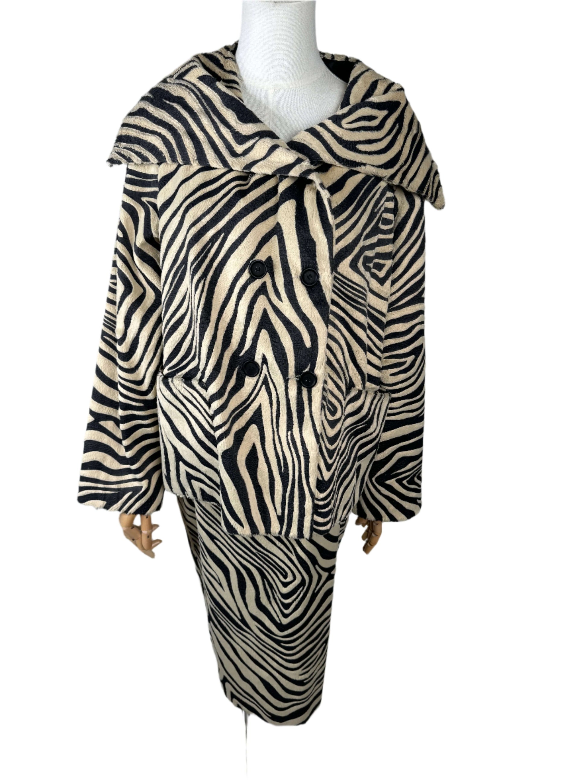 This brings out the hunter in me! Full zebra vintage 90s skirt suit constructed from a screen printed cotton and pelo blend. The vintage jacket brings the drama, its double breasted with pattern matched patch pockets, and an exaggerated fold over lapel. The fanned out shape of the coat has a total mod vibe. The skirt lengthens the silhouette with it's pencil shape and center slit up the back, darted at the waist to hug all your curves. Sourced in Italy.