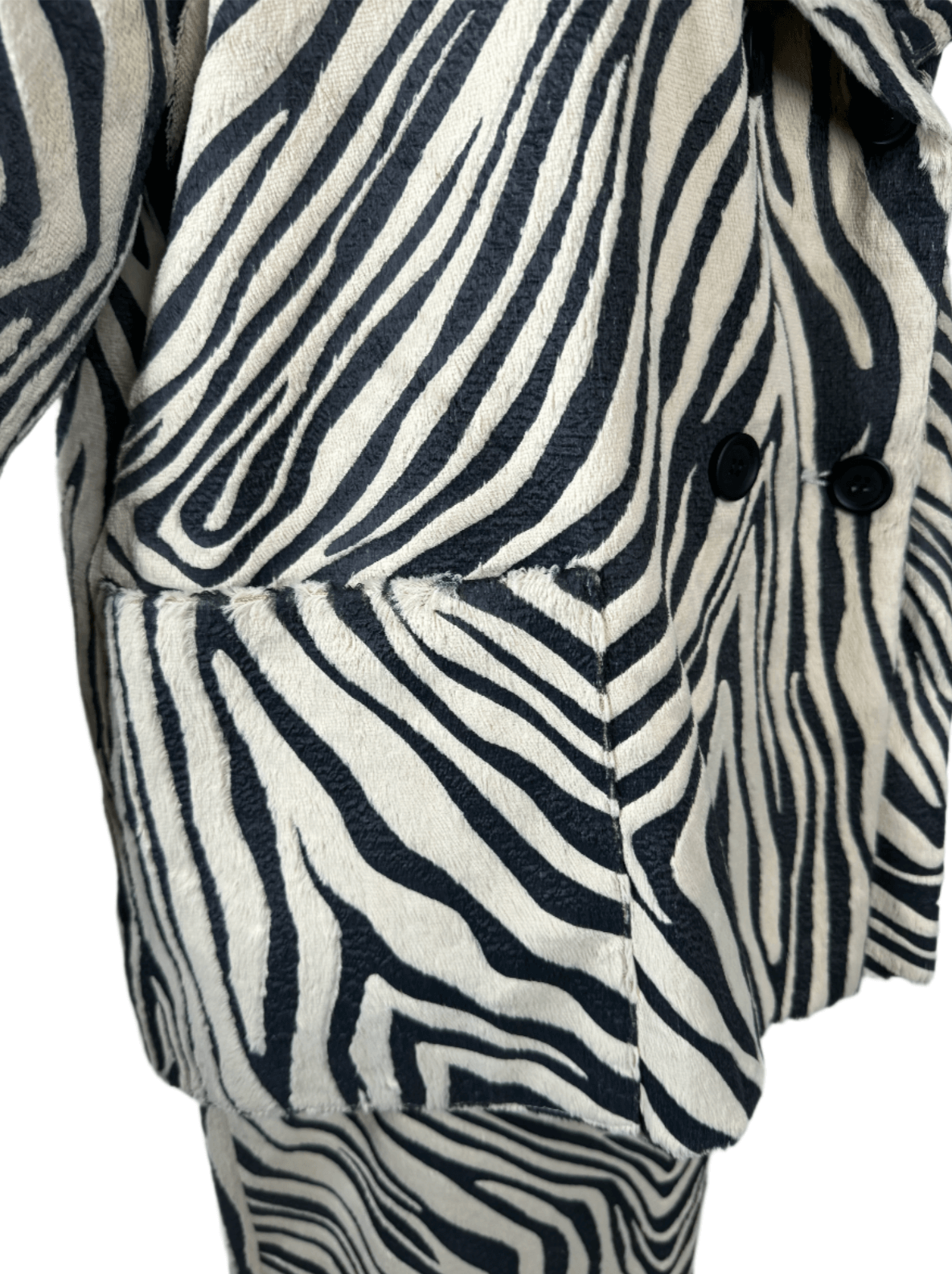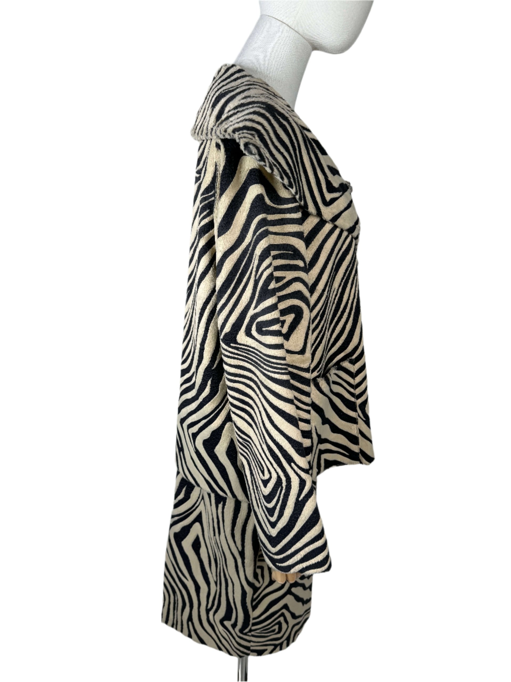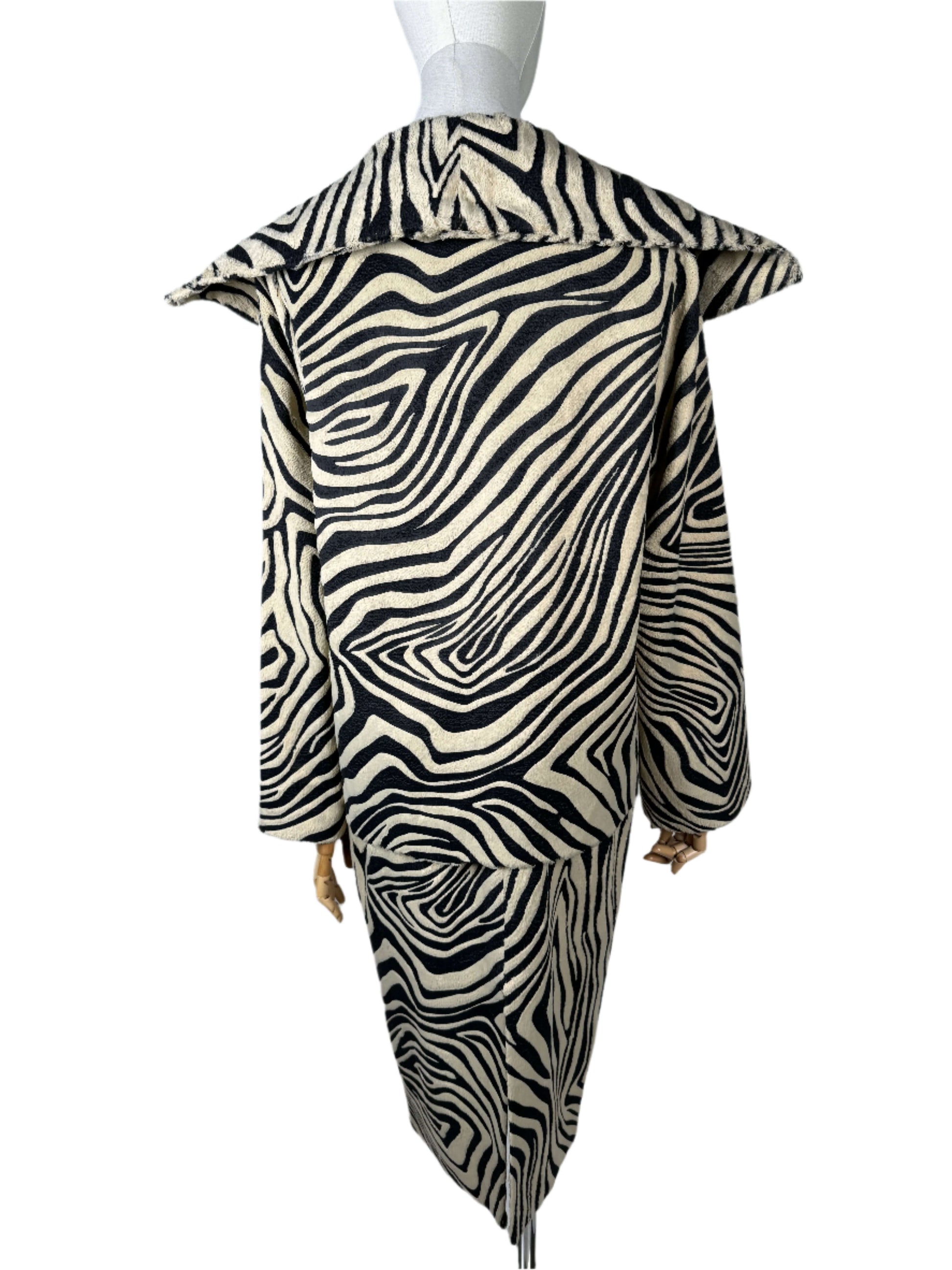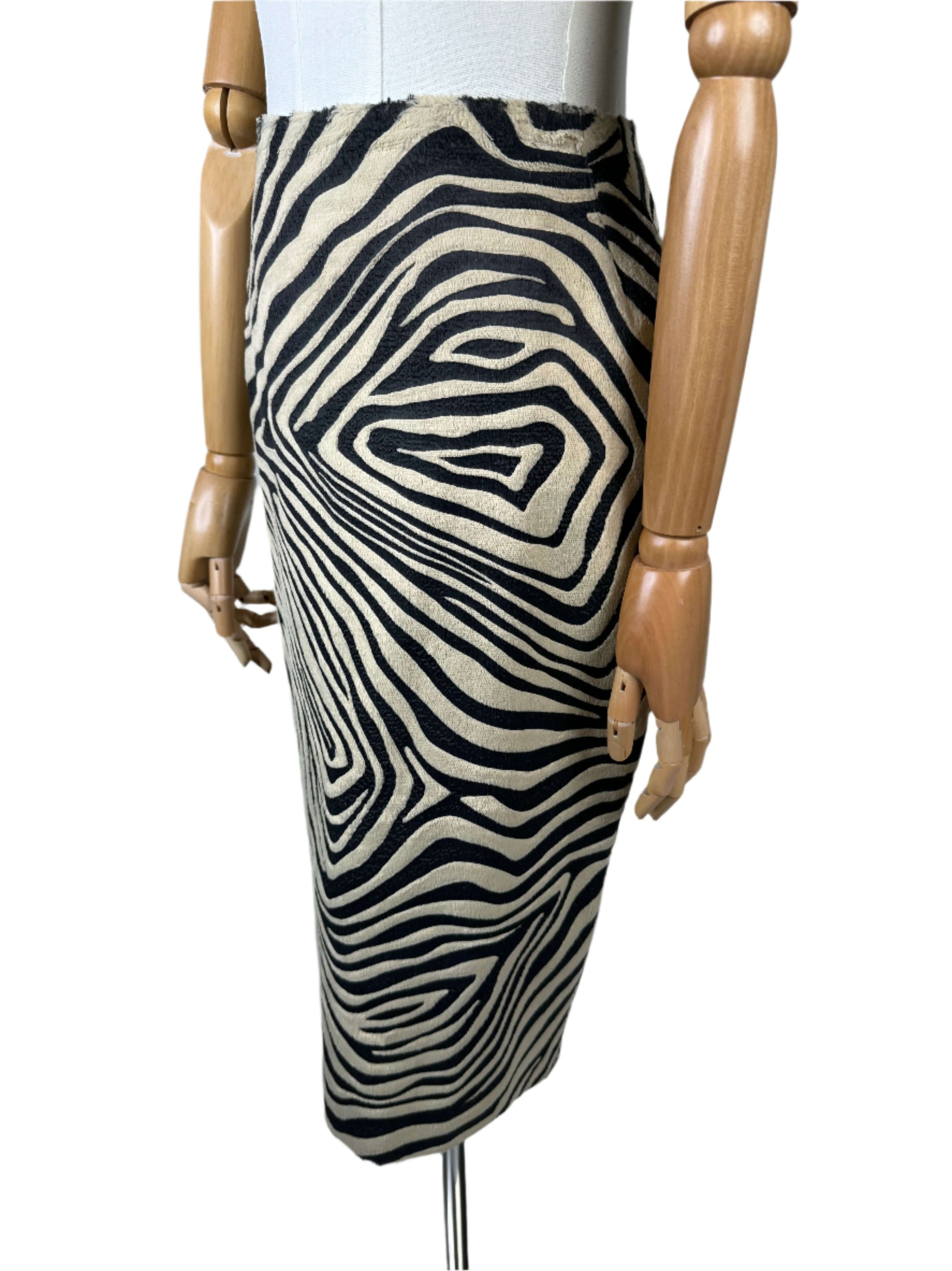 This brings out the hunter in me! Full zebra vintage 90s skirt suit constructed from a screen printed cotton and pelo blend. The vintage jacket brings the drama, its double breasted with pattern matched patch pockets, and an exaggerated fold over lapel. The fanned out shape of the coat has a total mod vibe. The skirt lengthens the silhouette with it's pencil shape and center slit up the back, darted at the waist to hug all your curves. Sourced in Italy.