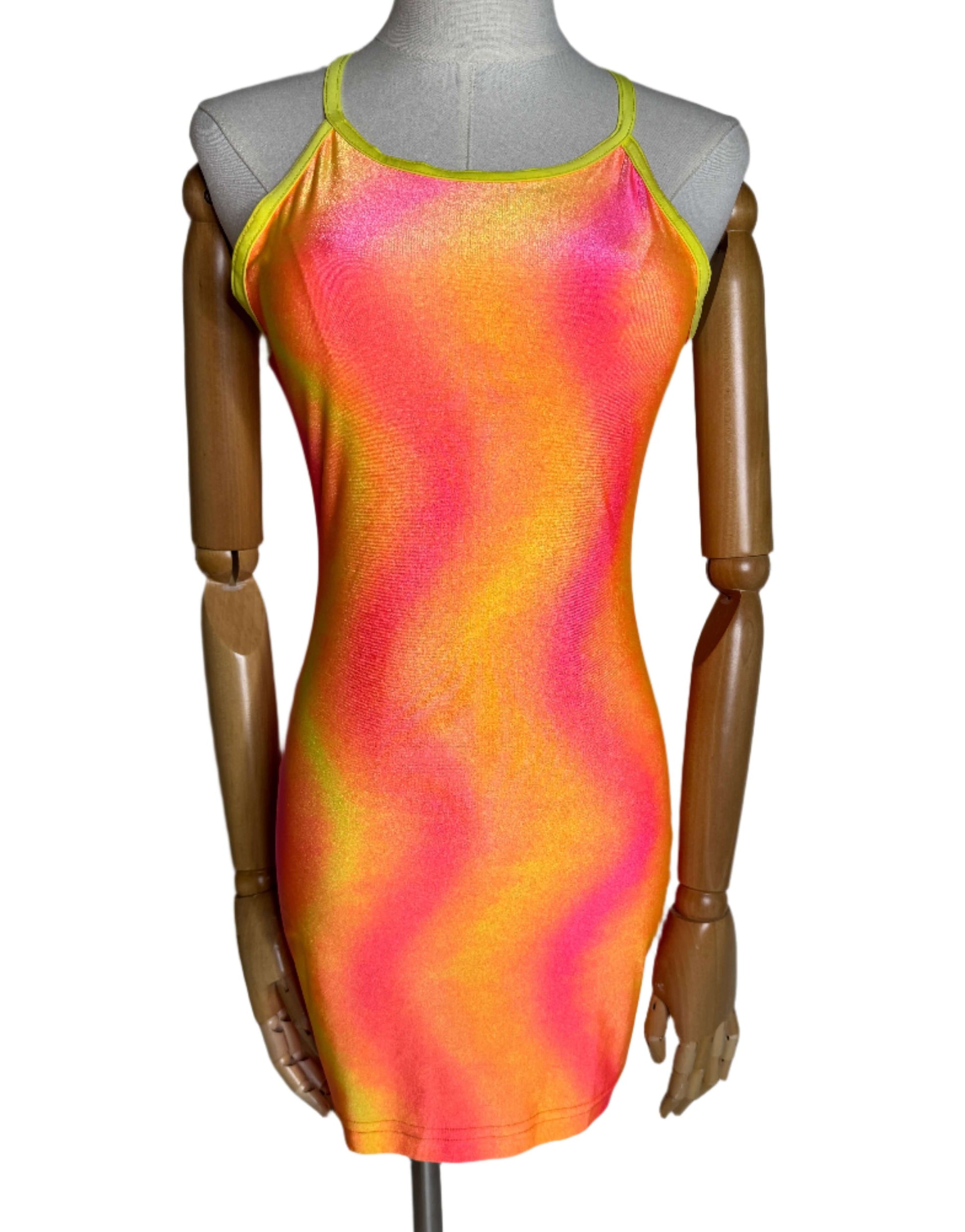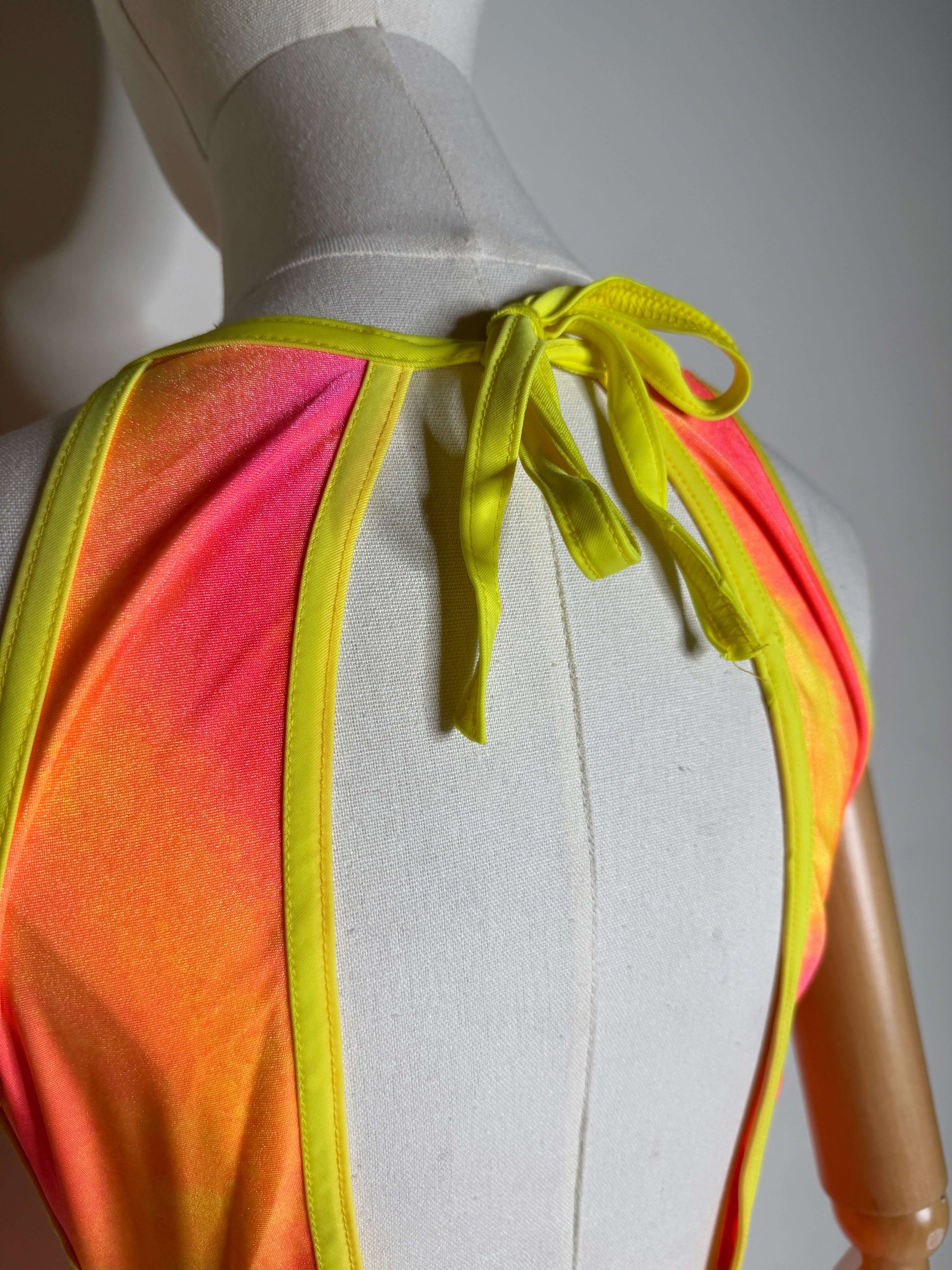 This 1990s neon orangey, pinkish yellow mini dress is oh so fun! Custom made for a dancer in the 90s, this dress is perfect if you're ready to have a good time and groove the night away! The neckline ties in the back making this dress adjustable & breathable. We call this the Lava Lamp dress.