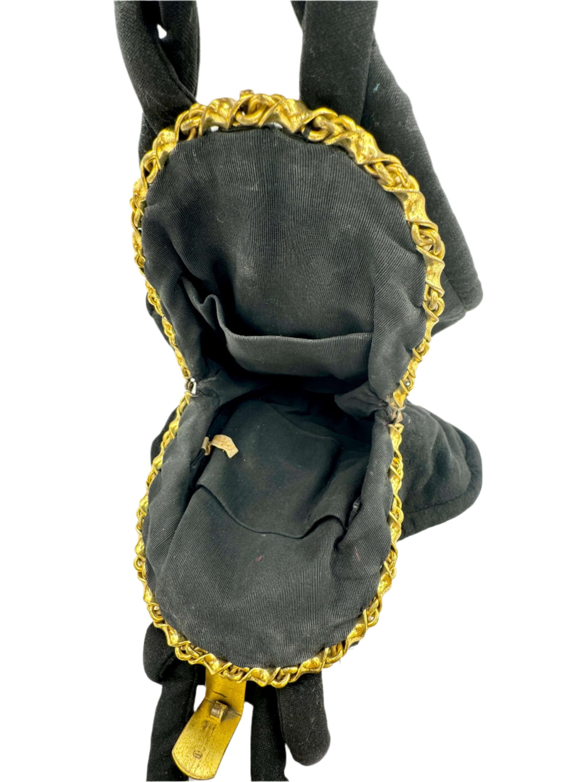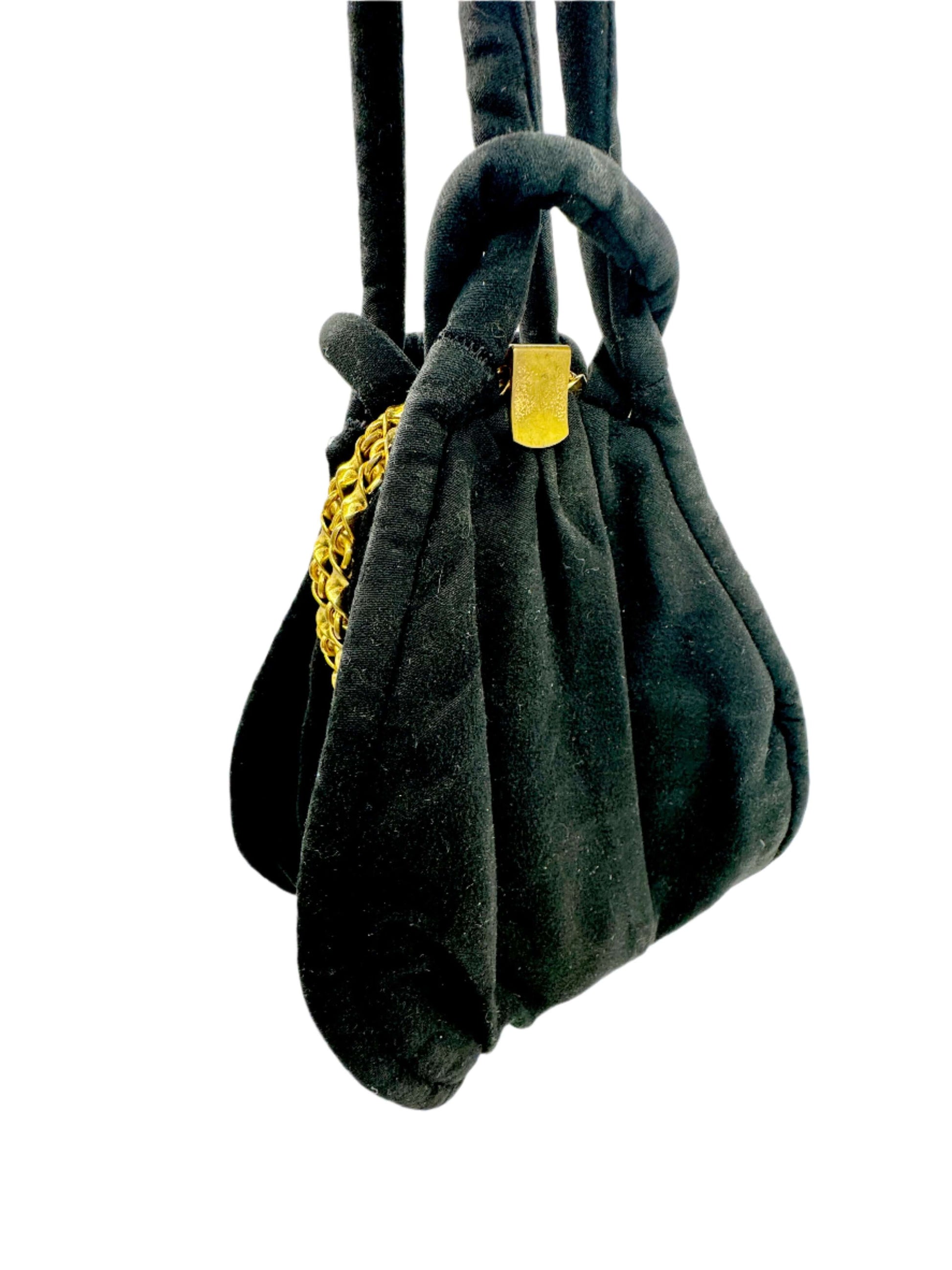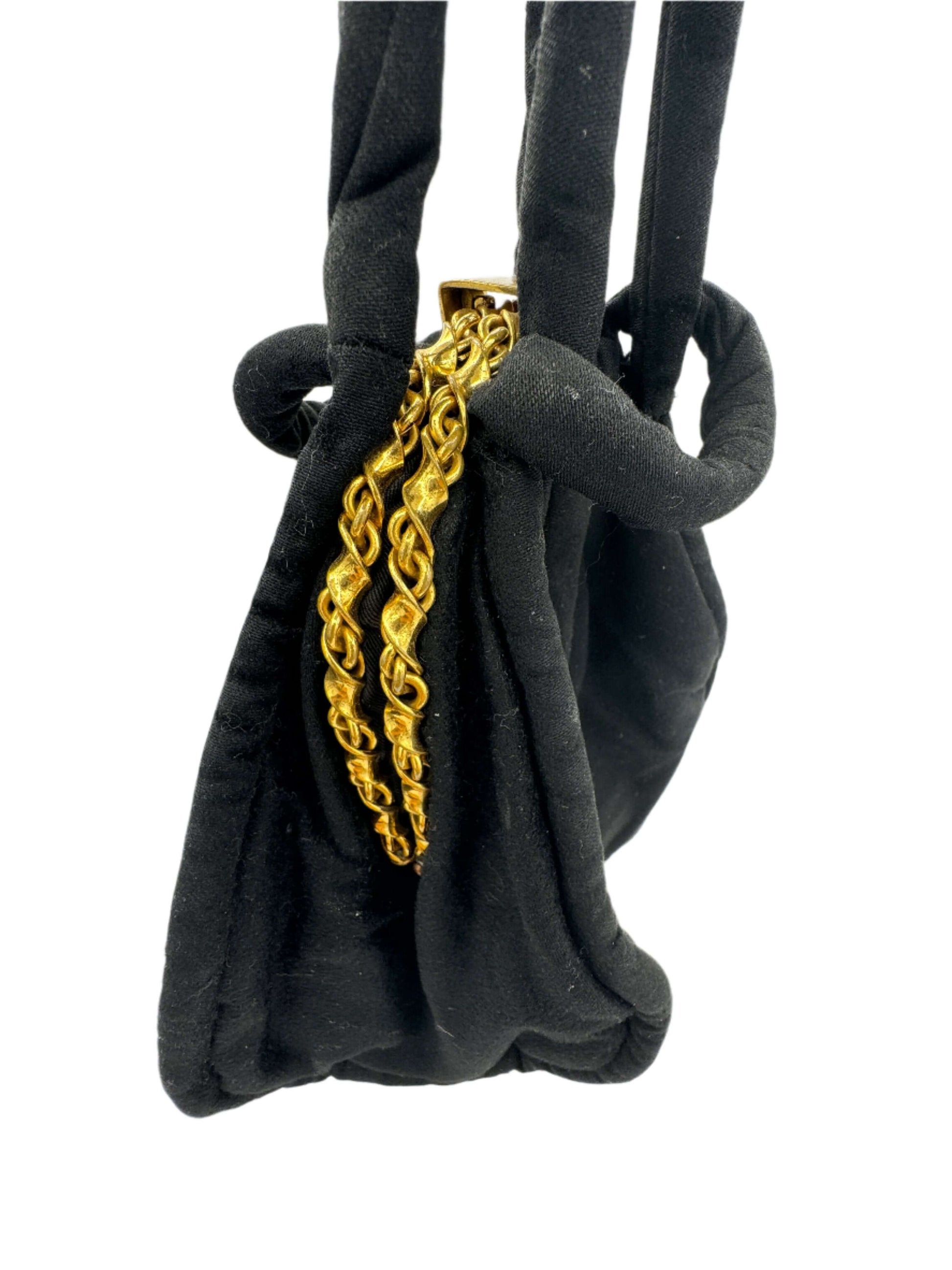 The perfect handbag for a sophisticated evening bag. Bring only the essentials and carry this bag like a bracelet, its more jewelry than purse. The opening features a twist chain in gold tone metal.