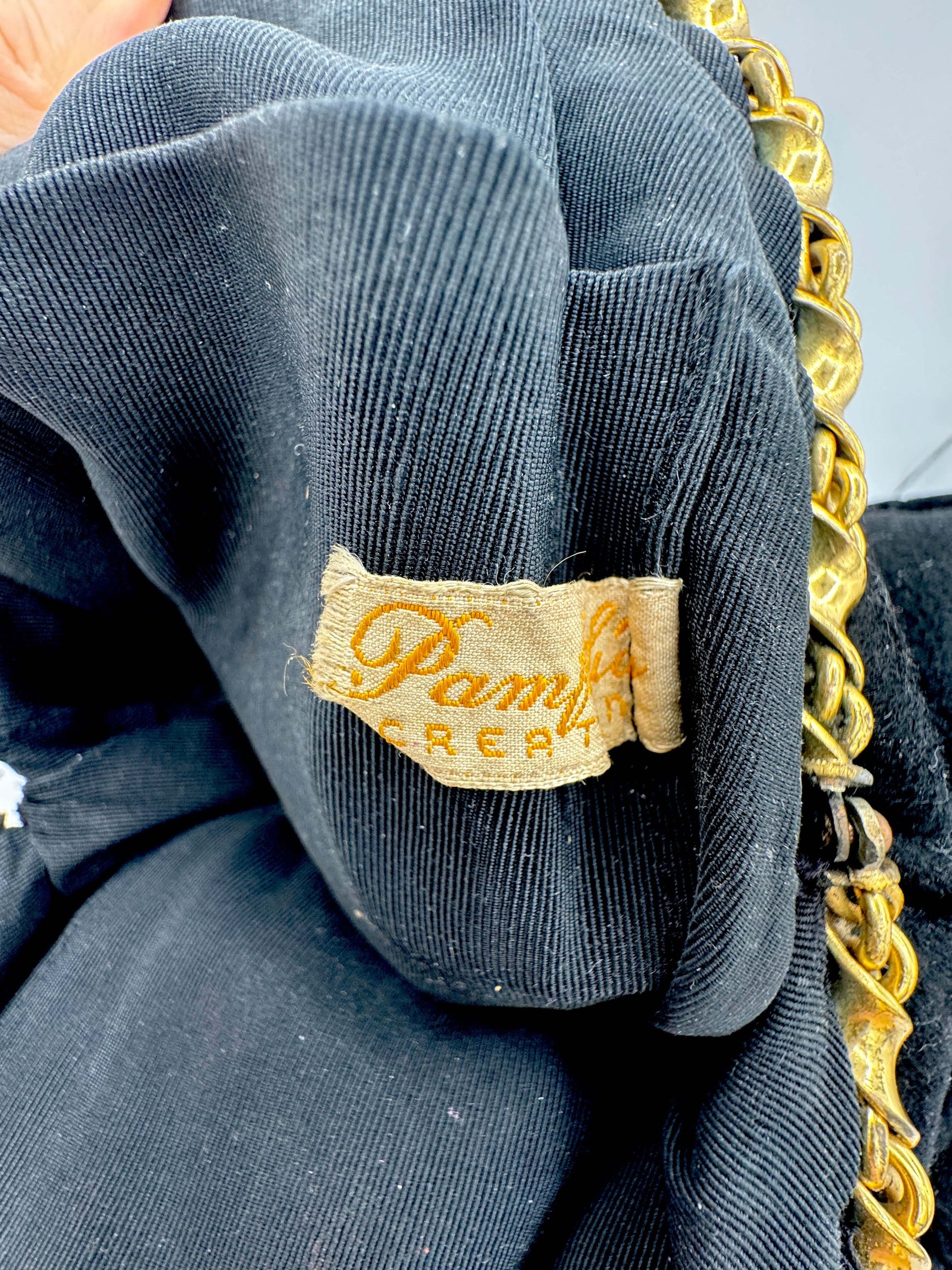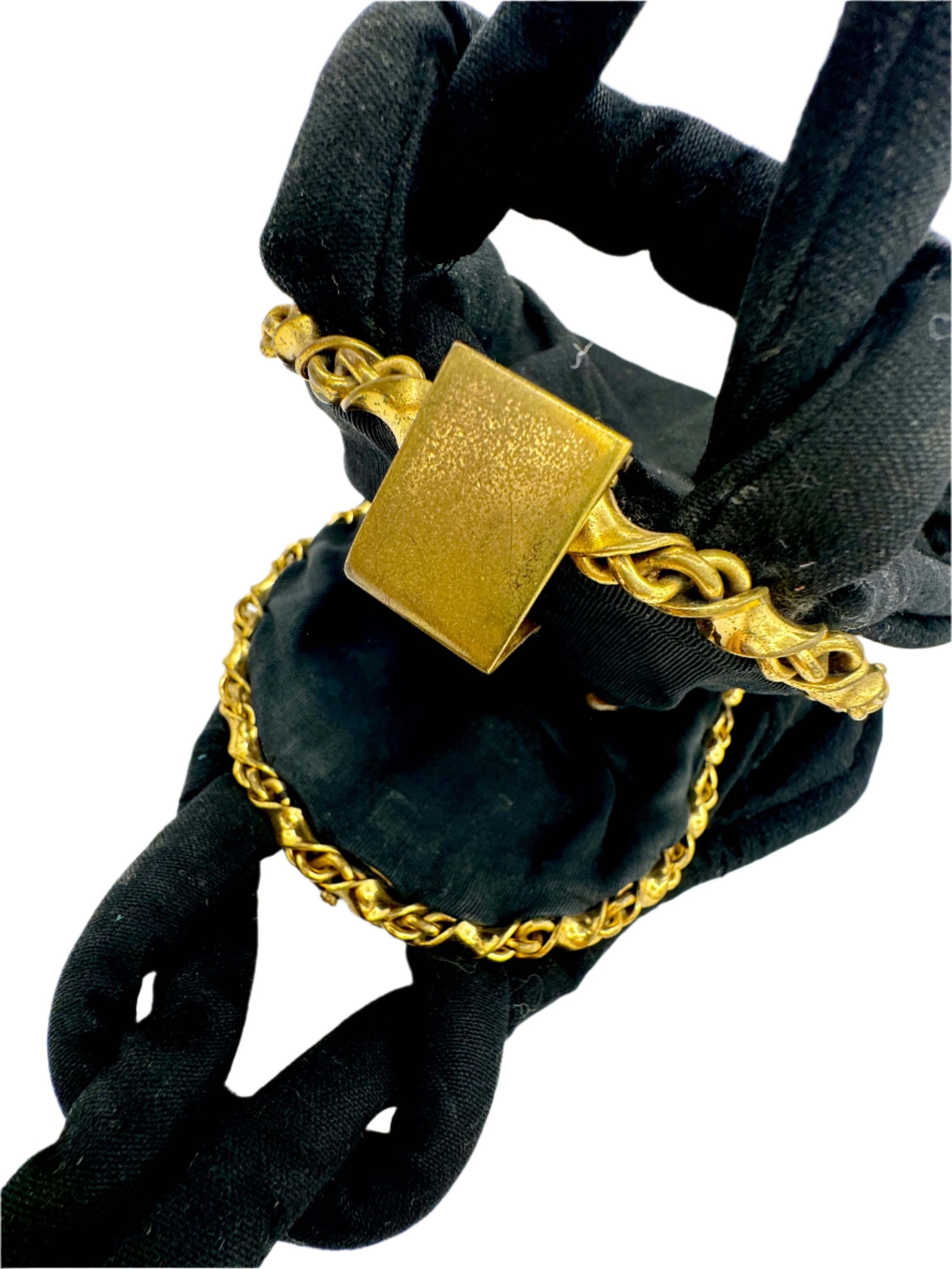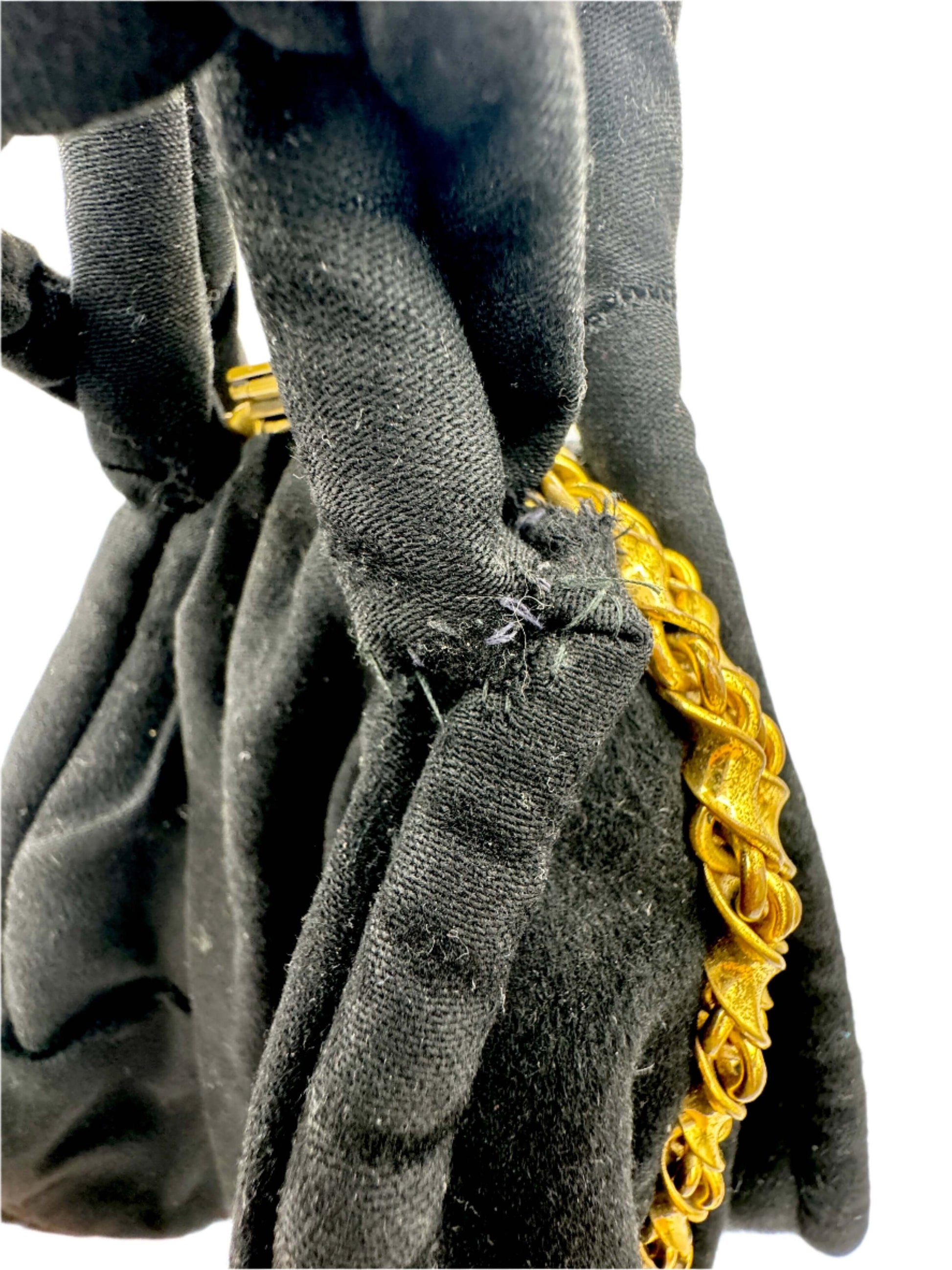 The perfect handbag for a sophisticated evening bag. Bring only the essentials and carry this bag like a bracelet, its more jewelry than purse. The opening features a twist chain in gold tone metal.