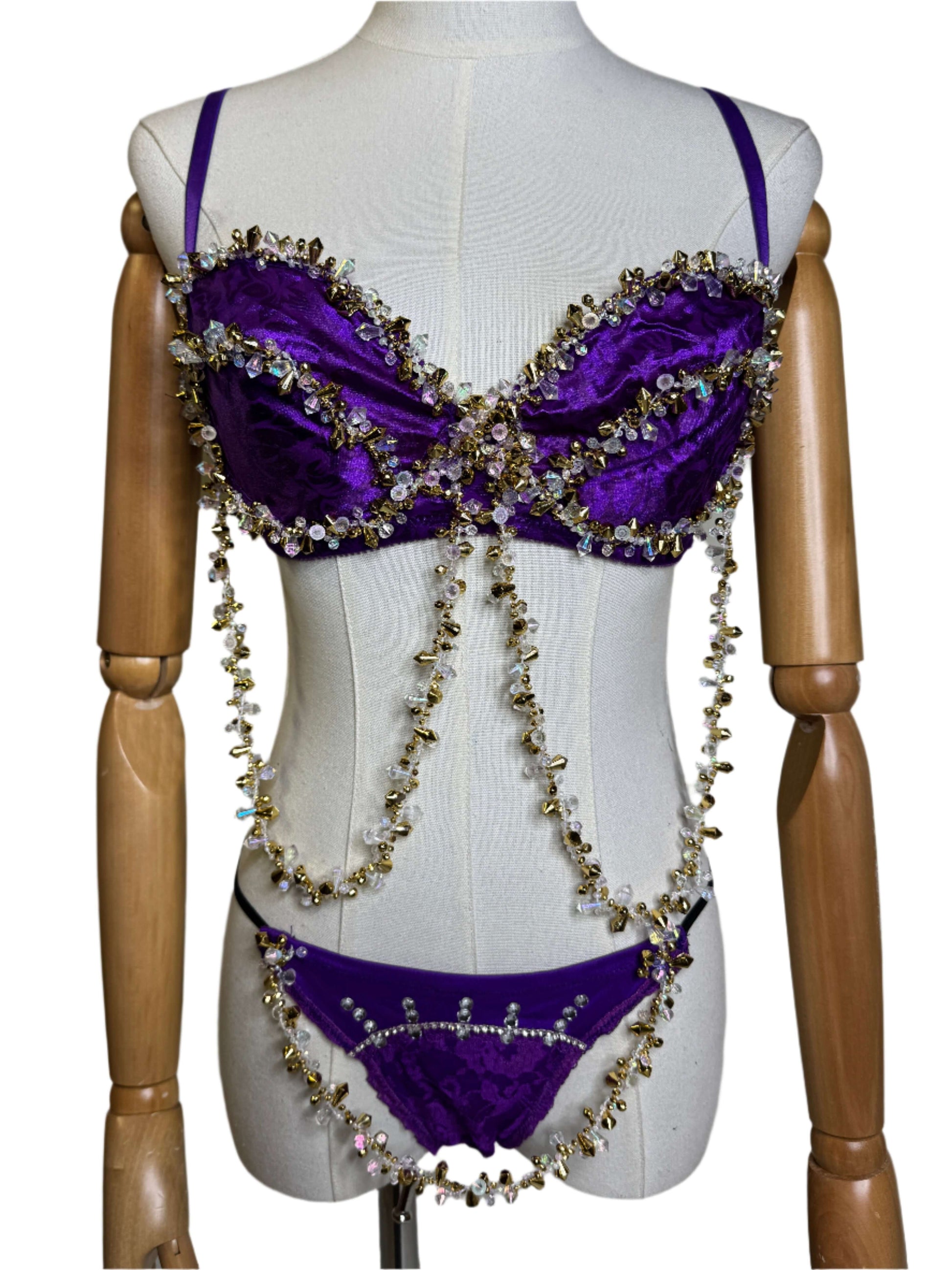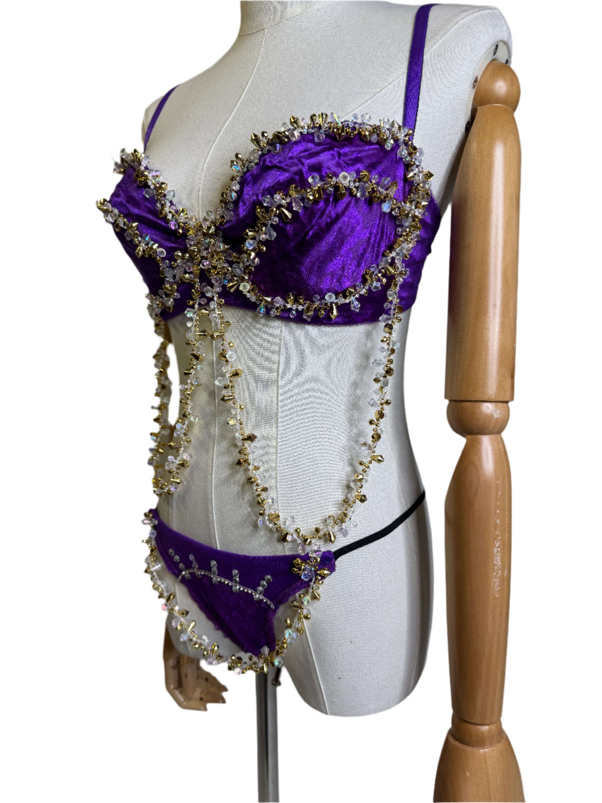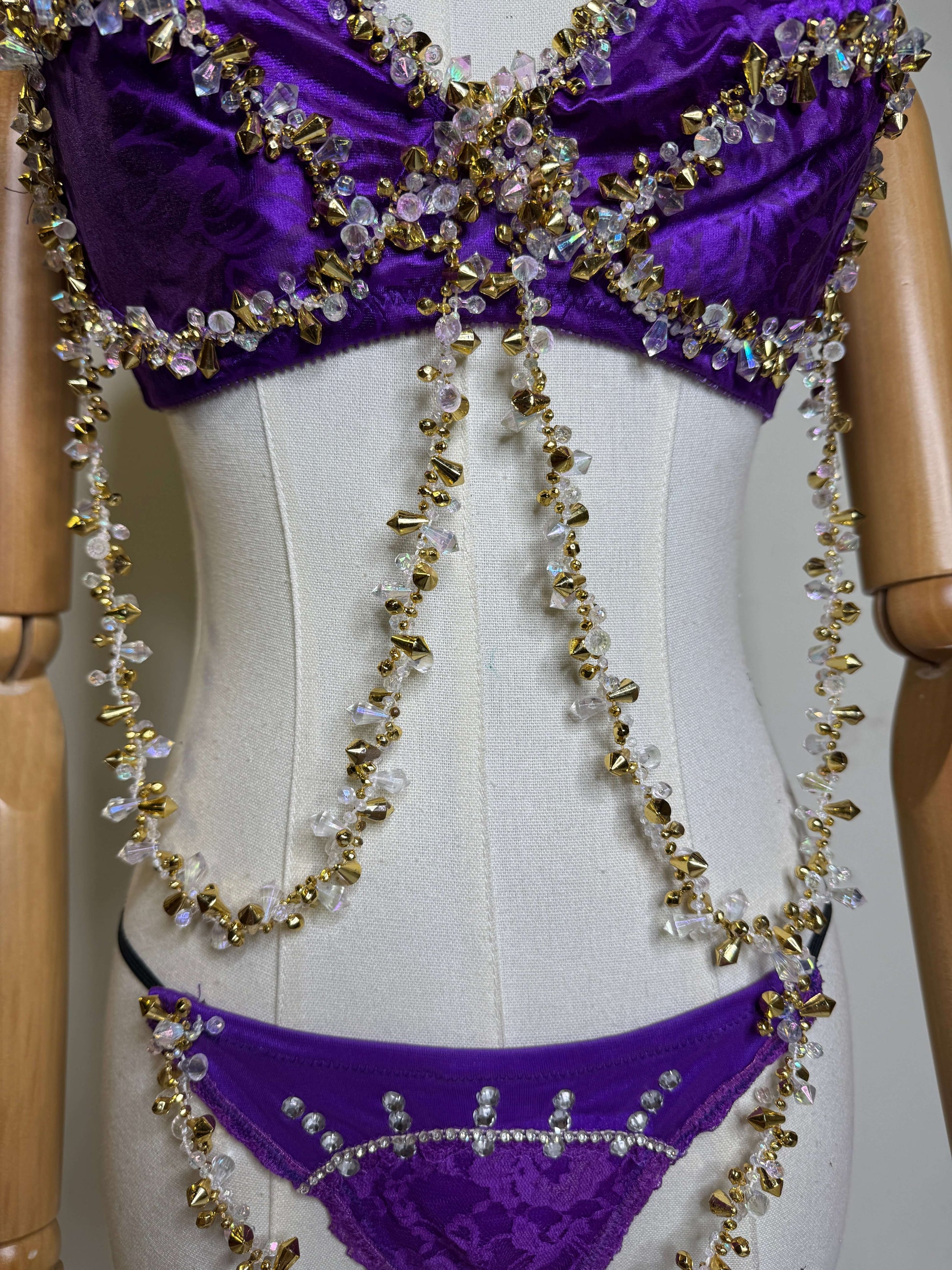 This 1980s hand beaded purple satin bra & panty set is absolutely fabulous! This set was custom made for a performer in the 80s and is in near pristine condition. Strings of gold beads hang from both the bra and panty making them ultra sexy. This set is perfect for any diva looking for a crazy fun time and a set that will break necks!
