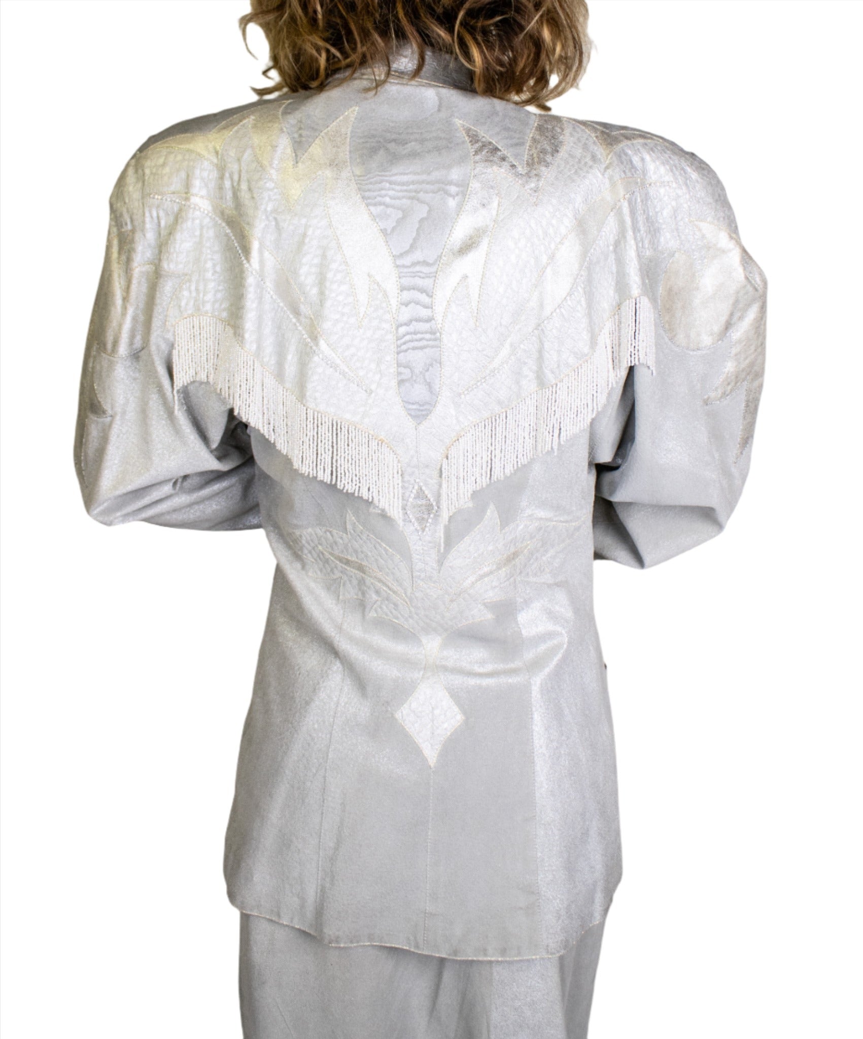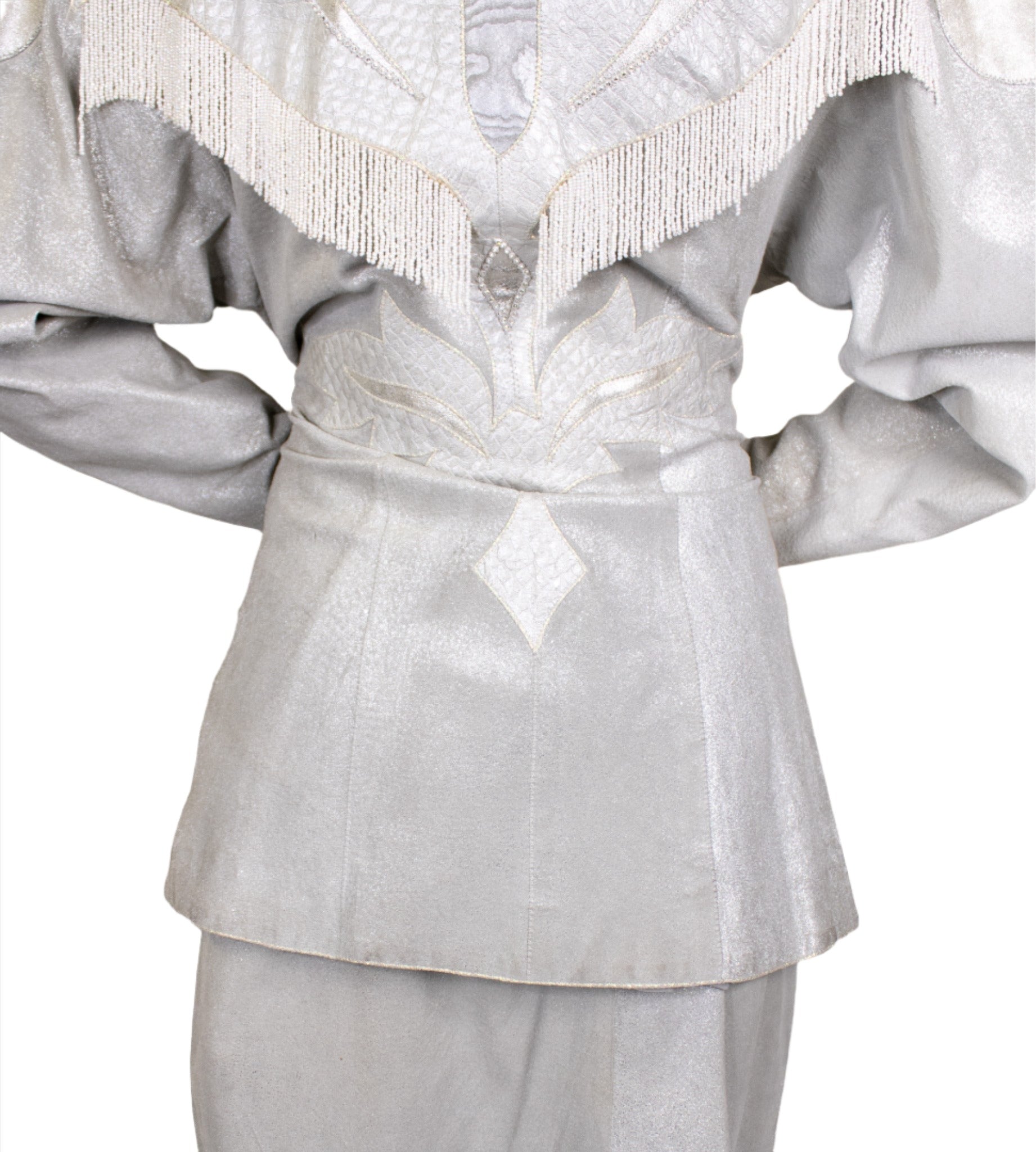 Eighties country western couture in its finest hour with this Roberto Cavalli silver suede western jacket with matching silver suede pencil skirt. WOW! The jacket is insanely detailed, dolman sleeves, front pockets, silver snap button, paneled throughout, and circled with beaded fringe. Dolly Parton called to approved this performance outfit that will be the main attraction unless you can sing! Sourced in Manhattan. Made in Italy. Former cool.