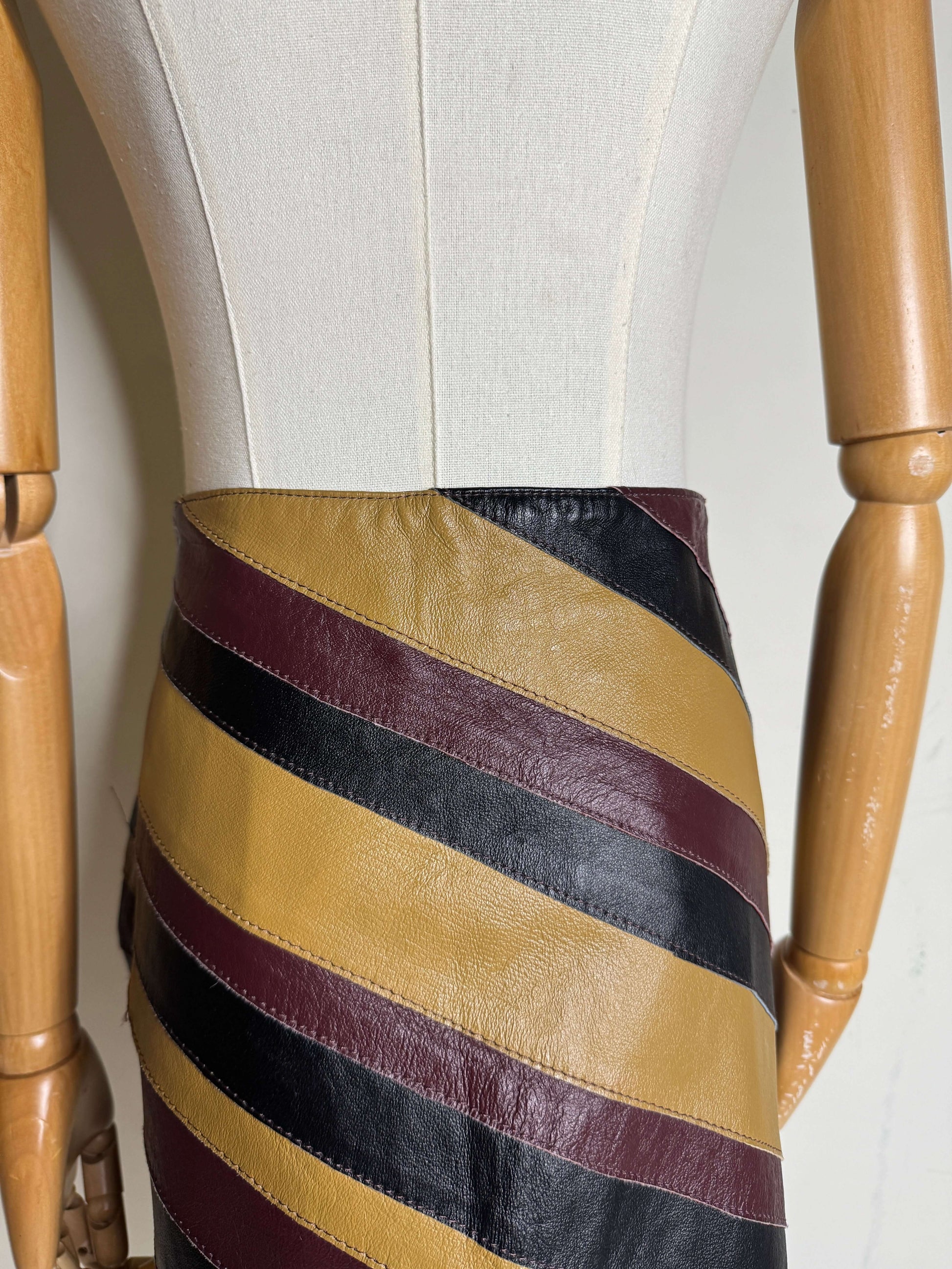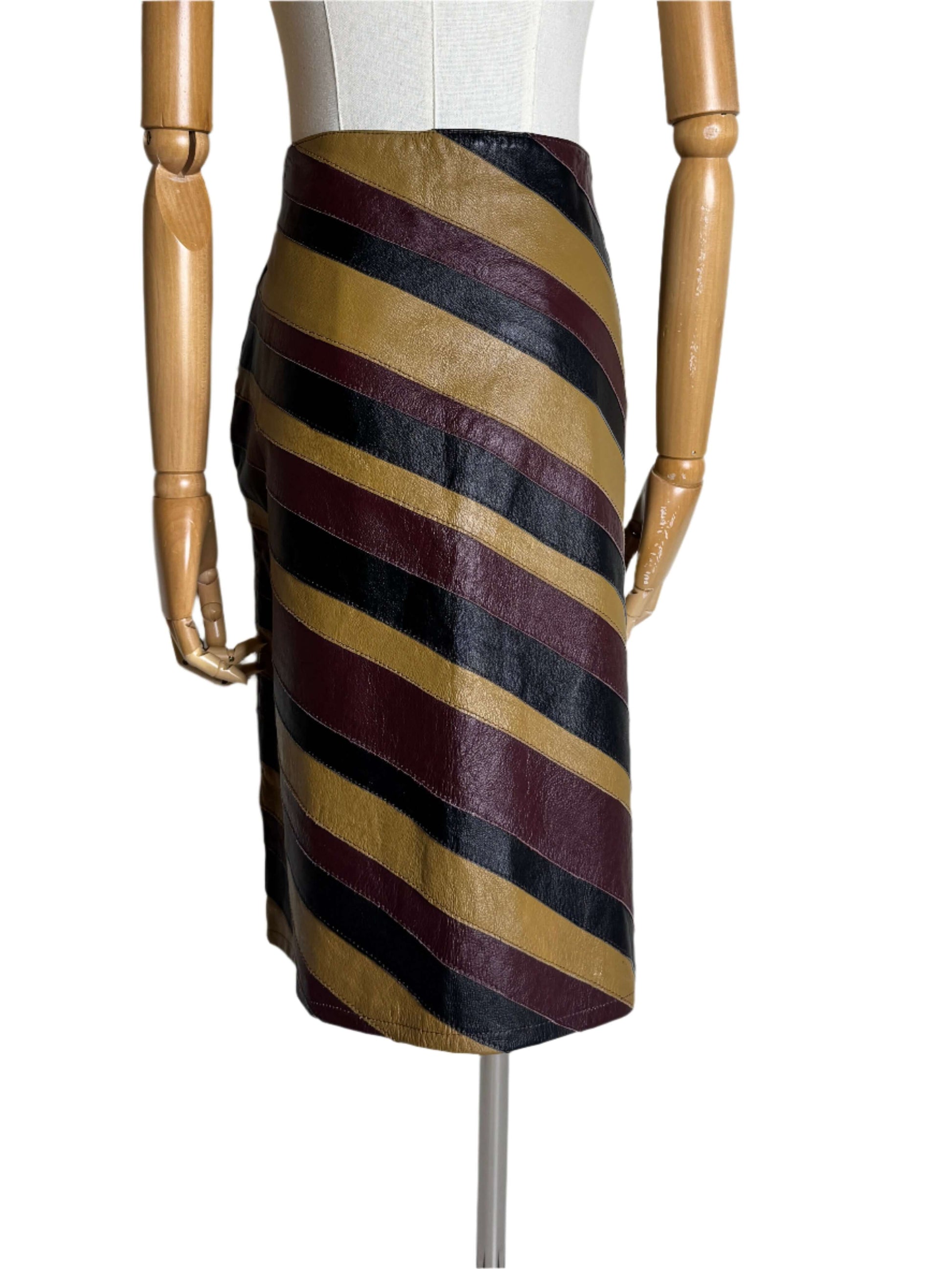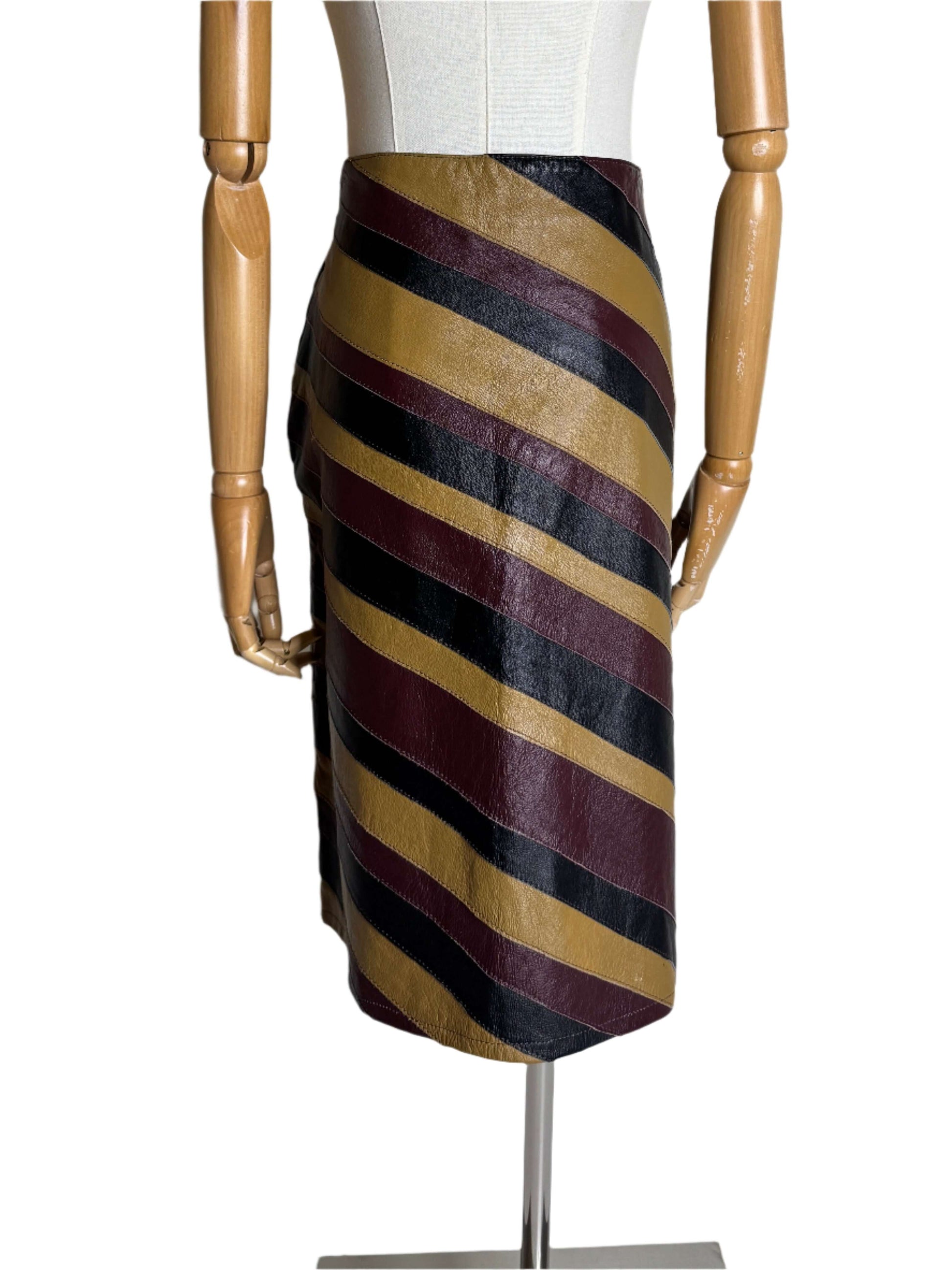 Leather diagonal stripes like you've never seen before! This vintage 90s Santa Fe skirt is just the right length to keep it professional but not boring. The leather stripes of various widths are in black, tan, and burgundy. It is very Bottega Veneta.