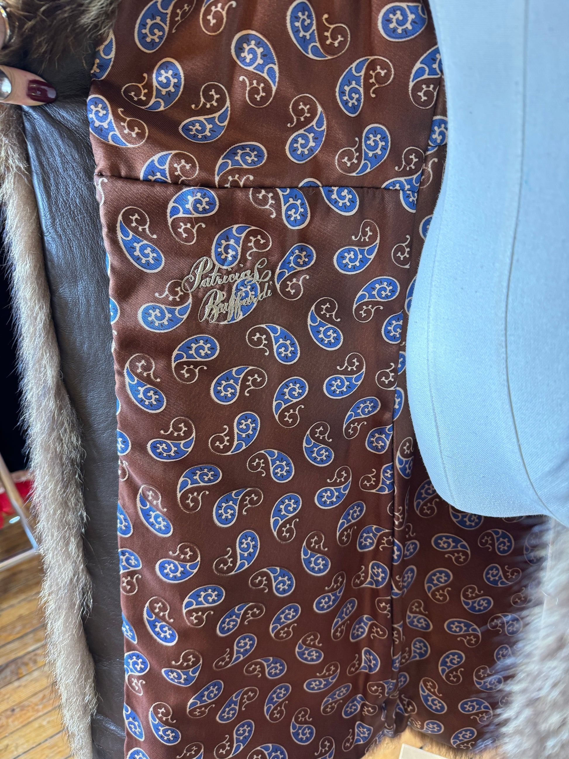 This coat is a 1960s luxurious dream! Head to toe, white spotted Serval Fur with a brown & blue paisley interior. The serval is a medium-sized wild African cat that is a descendant of the lion. The coat has a rare pattern that makes for a true show-stopper. Complete with deep pockets and one eye & hook clasp for closure.