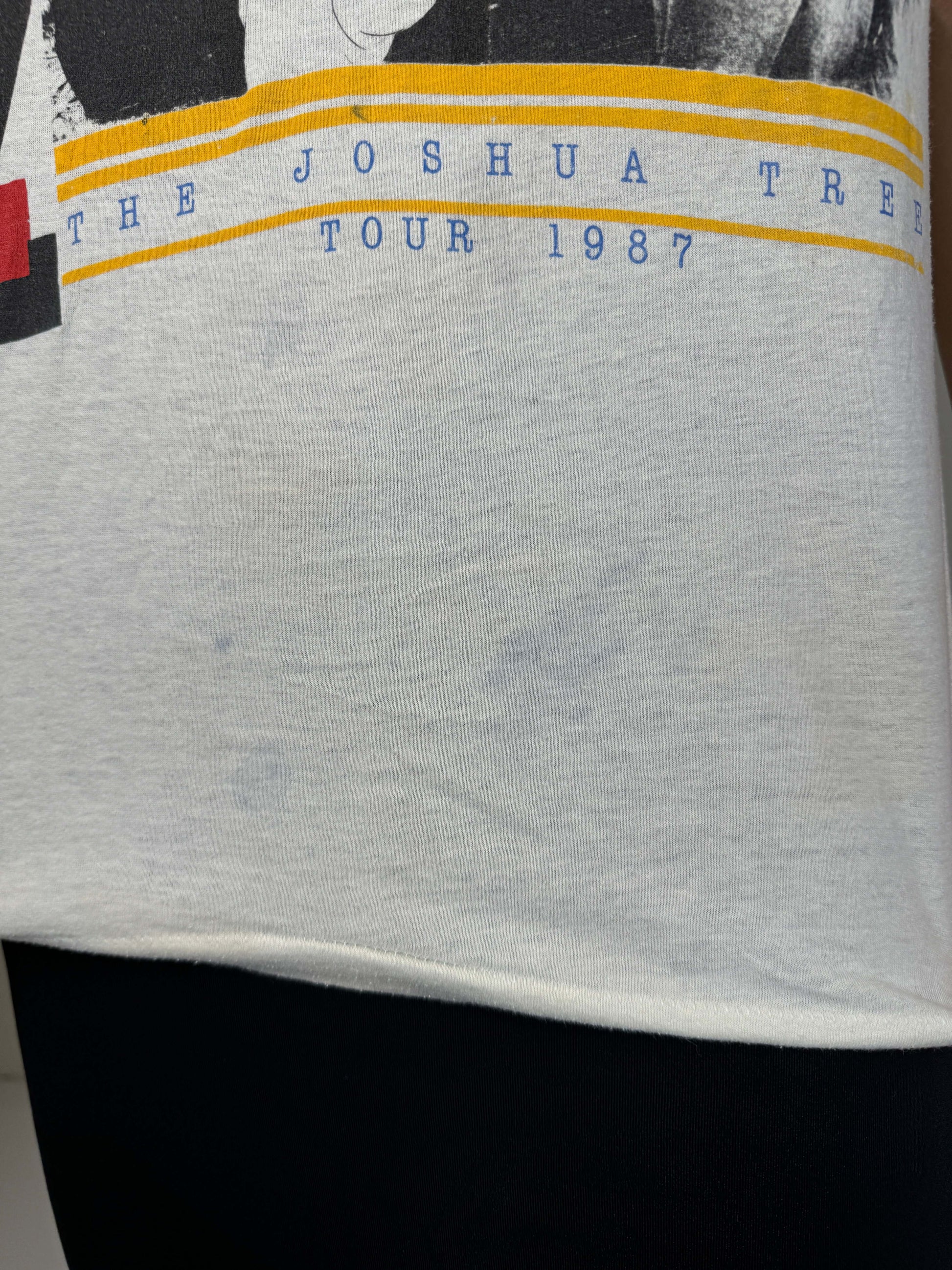 Own a piece of history, with this U2 Joshua Tree Tour t-shirt in white 1987. Featuring images of the band on the front and a Joshua tree on the back. U2 rock legends from Dublin, Ireland, formed in 1976. Joshua Tree was the bands fifth album, that received the greatest critical and commercial success. This album sold 25 million copies and produced two American number one hits. U2 is still touring after 45 years, they were selected to play at the Sphere in Las Vegas for the opening.