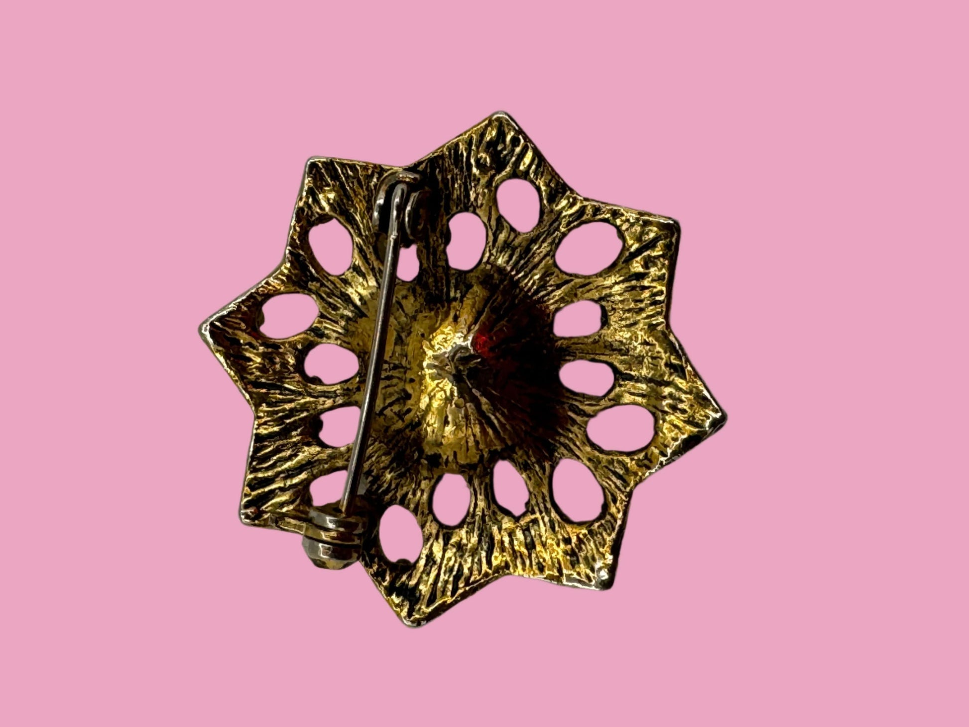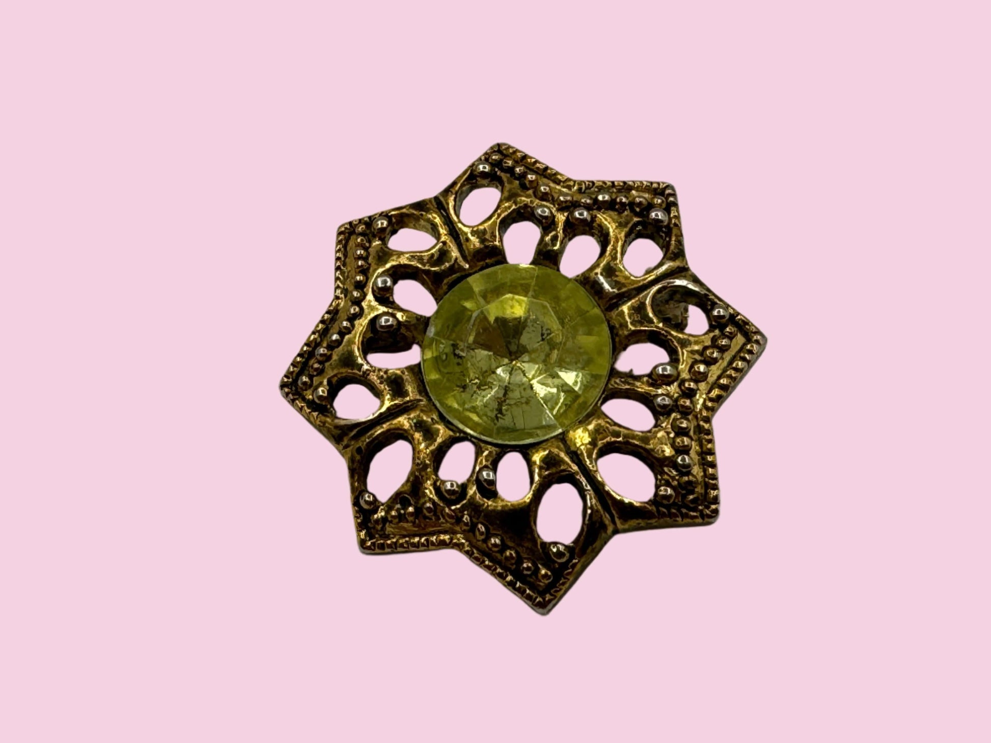 A Victorian brooch, crafted in brass, it is an artful and intricate star design. The vintage pin is adorned with a faceted green rhinestone. This piece of antique jewelry is not marked but will still impress.
